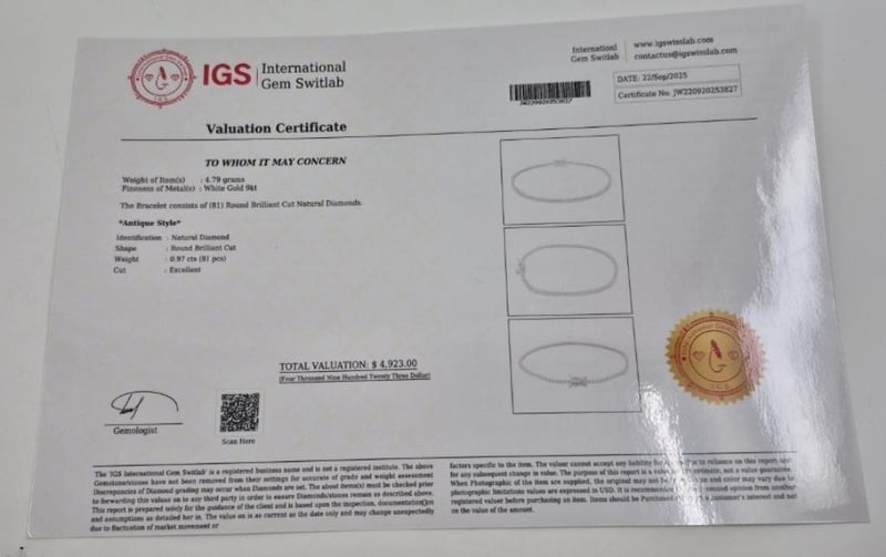 9K WHITE GOLD DIAMOND BRACELETFeaturing 0.97 Tcw, Round Brilliant Cut Natural DiamondsTotal Item Weight: 4.79gCondition: Good - Refer To ImagesThis valuation has been conducted by an independent third-party professional. The valuation amount is an assessment by the issuing valuer and does not reflect the auction value of the item.Any inquiries regarding the valuation should be directed to the issuing valuer (refer to contact details on the certificate), as Lloyds Auctions has no affiliation or influence over the valuation, the valuer, or the stated amount.Insurance Replacement Valuation Amount: $4,923.00VAULT587701+2