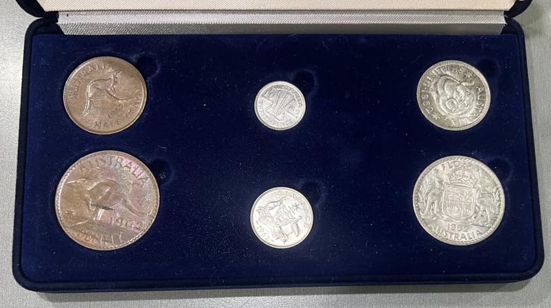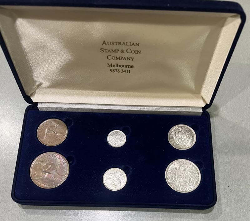 1962 AUSTRALIAN STAMP & COIN SIX COIN PRE DECIMAL COIN, PENNY, HALF PENNY, SILVER FLORIN/SHILLING/SIX PENCE & 3 PENCE SET