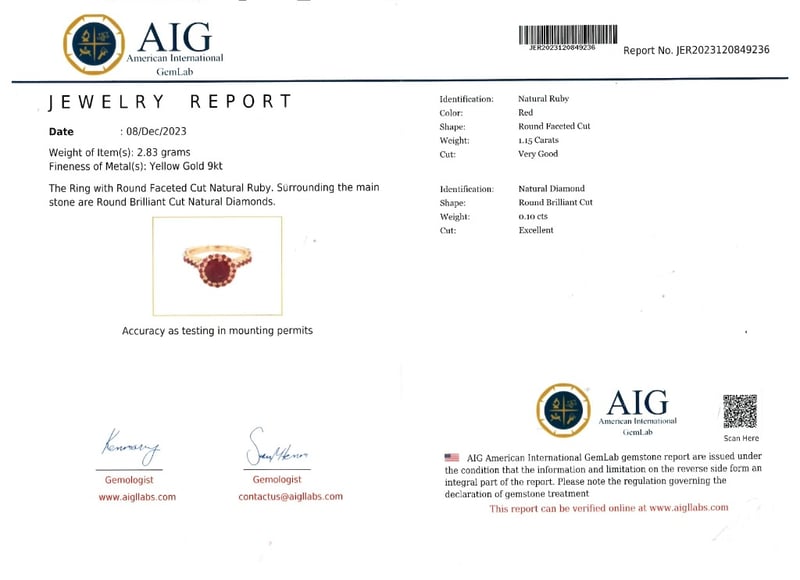 9CT YELLOW GOLD RUBY & DIAMOND RINGIncludes Aig Jewellery Report,Natural Ruby : 1.15 Carat Natural Diamond : 0.10 CaratTotal Item Weight: 2.83g584974+4