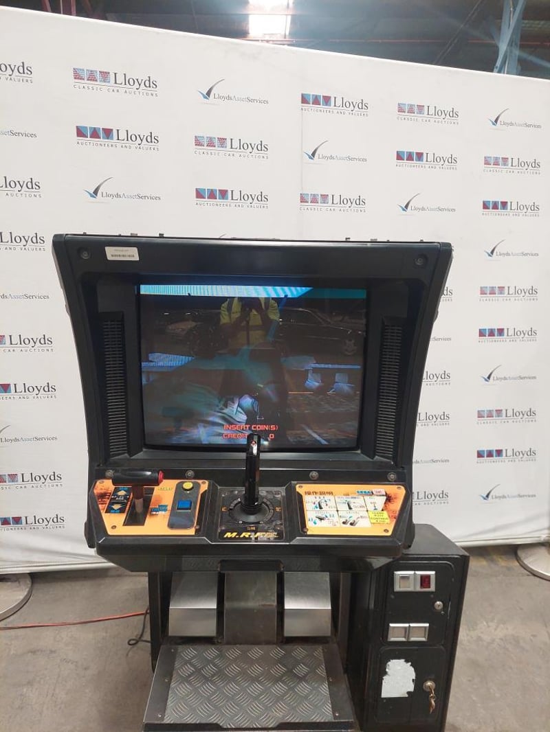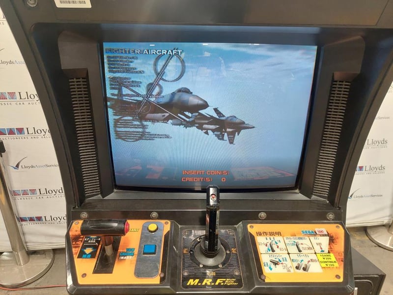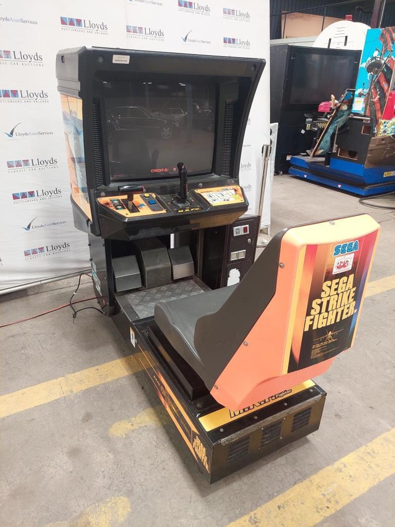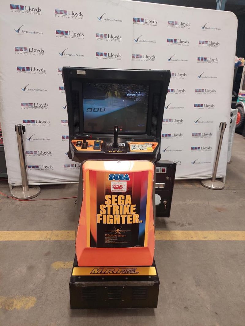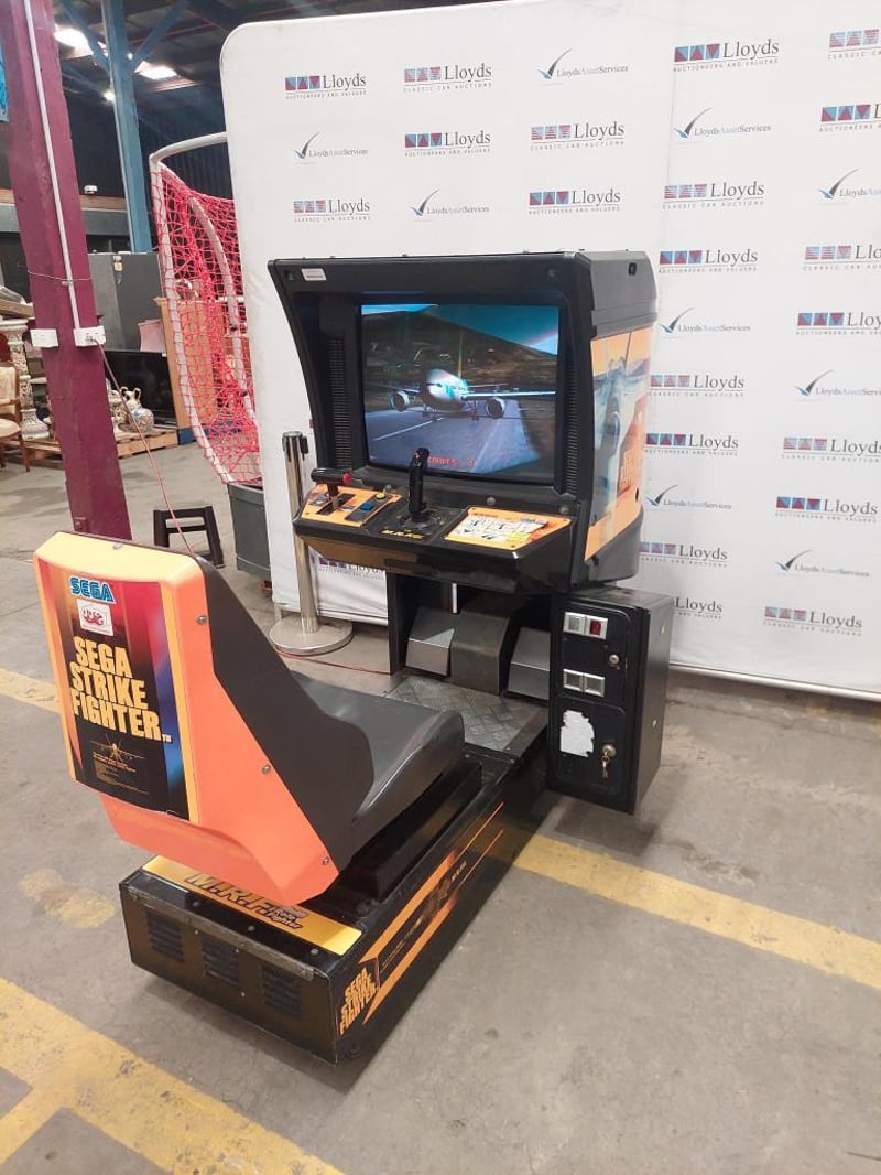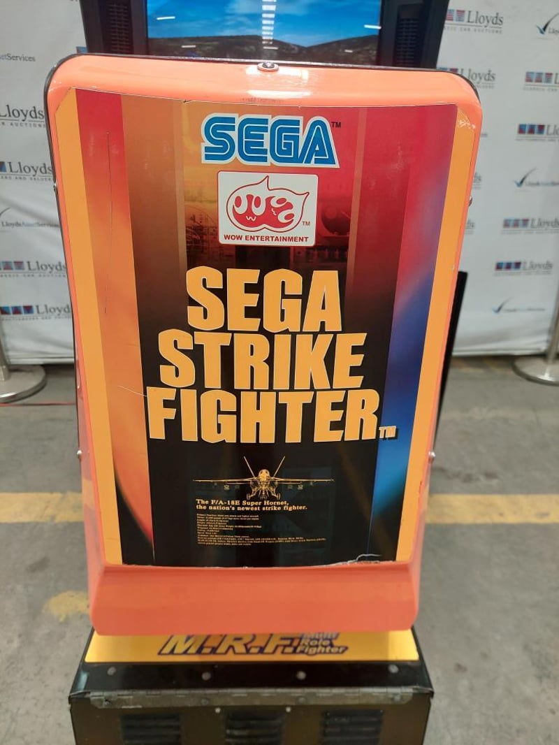 Sega strike fighter "Original Japanese machine, game is working and in English. Become the pilot of your own F/A-18 Hornet aircraft, battling your way through using guns and missiles whilst avoiding the enemies! Controls include rudder pedals, flight stick and thrust lever. A unique arcade game. Coin mechs removed, locks and keys supplied. Spare plastic main joystick lever supplied " Manufactured by Sega Enterprises Ltd, Serial number: 01028561 Dims: 152cm H, 190cm W, 105cm L Note: item is untested, signs of wear, inspection recommended.