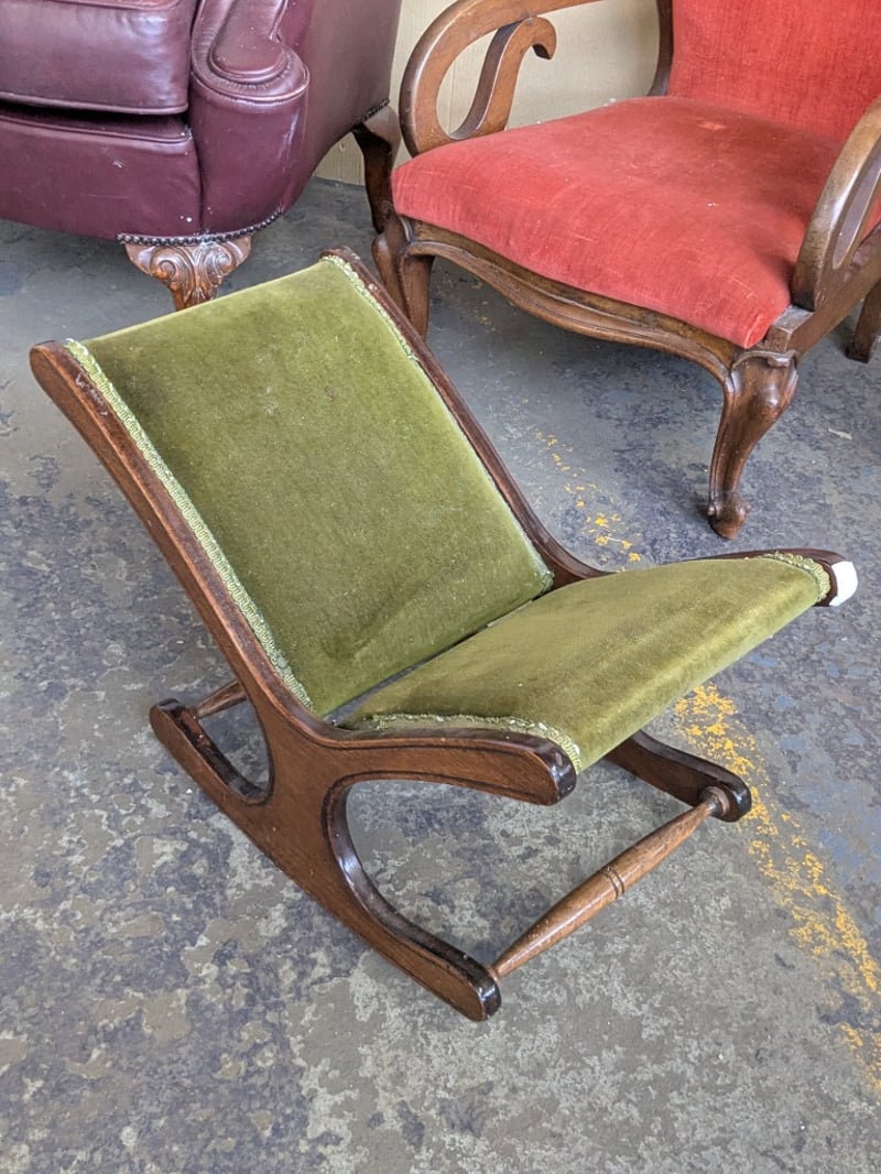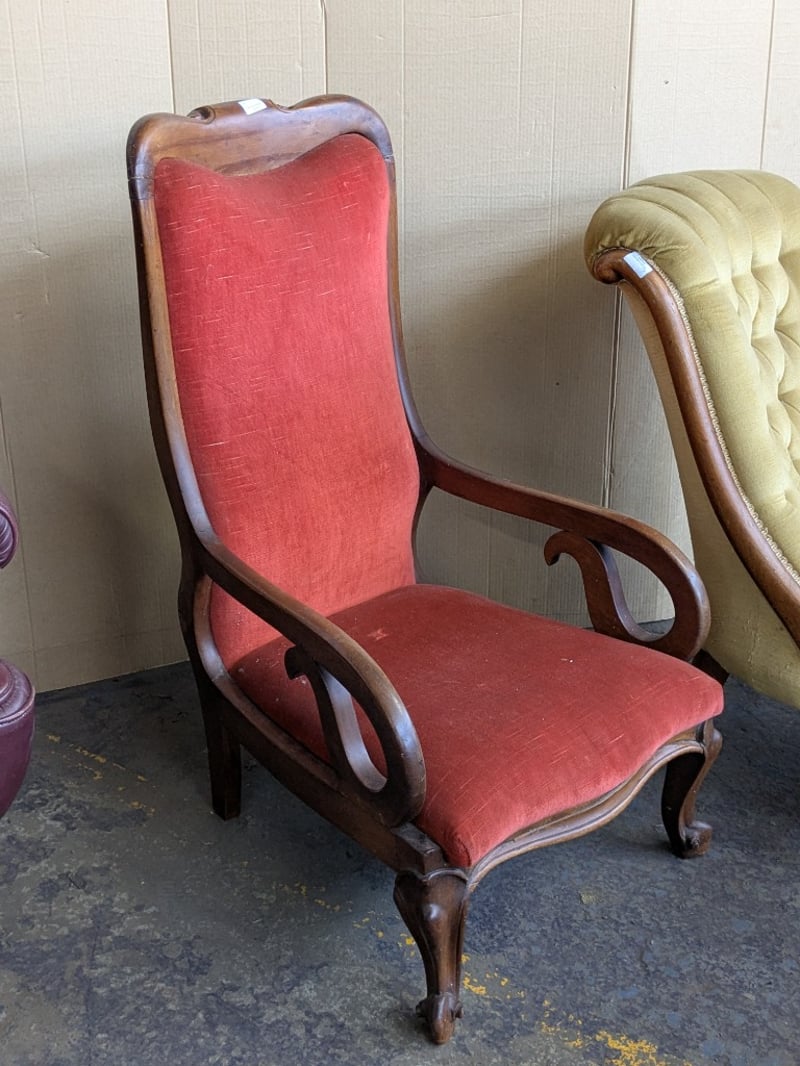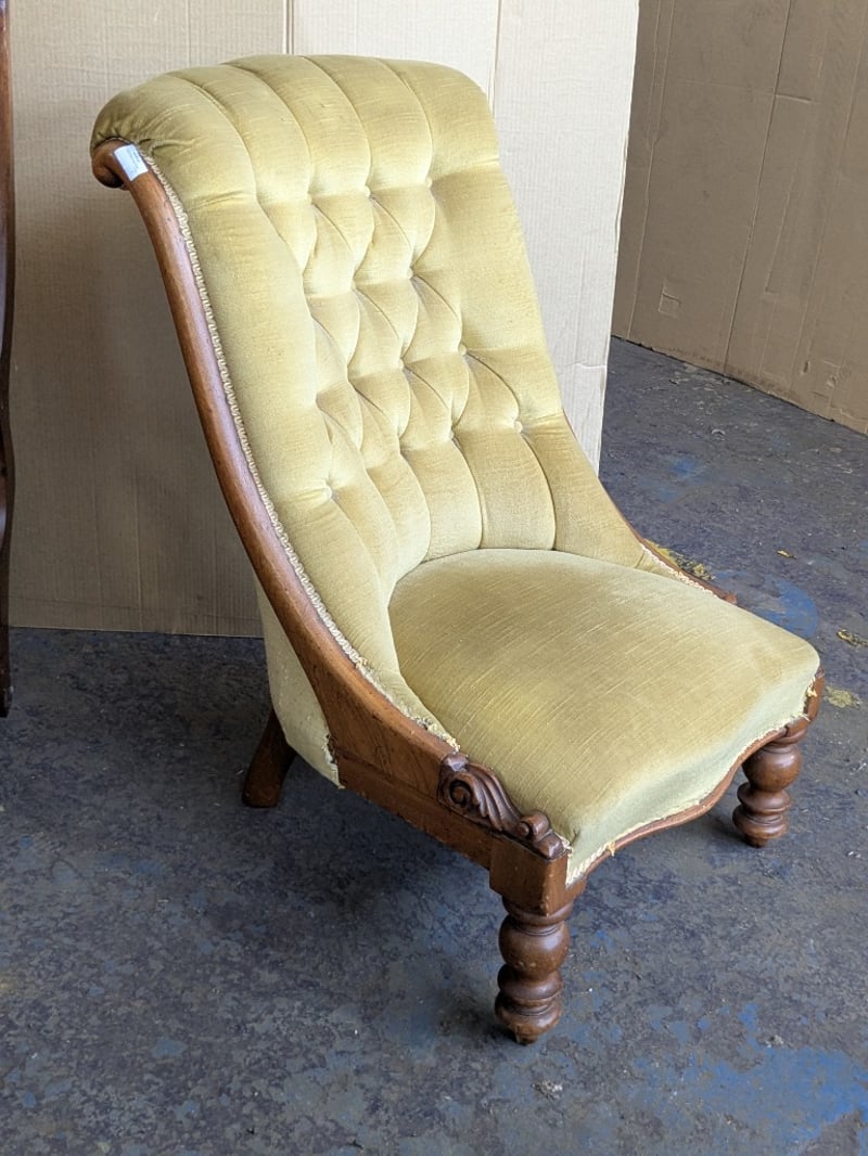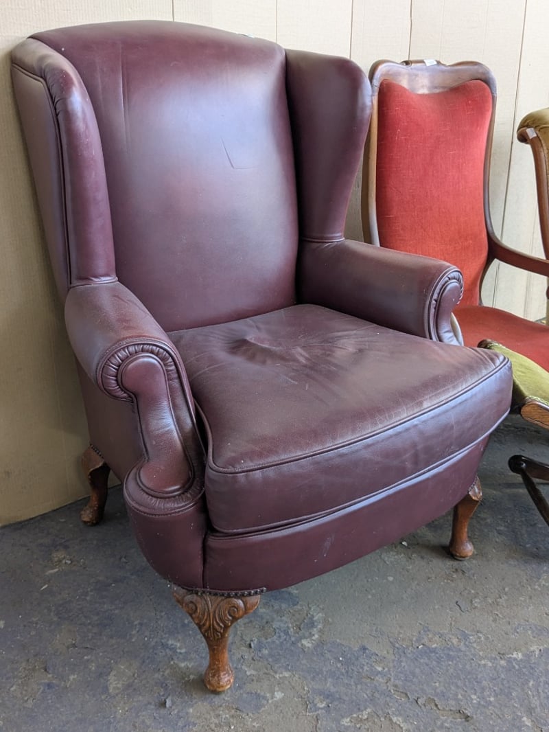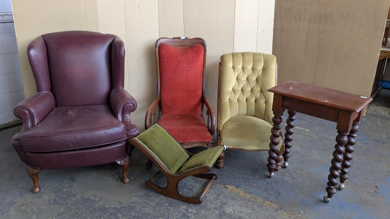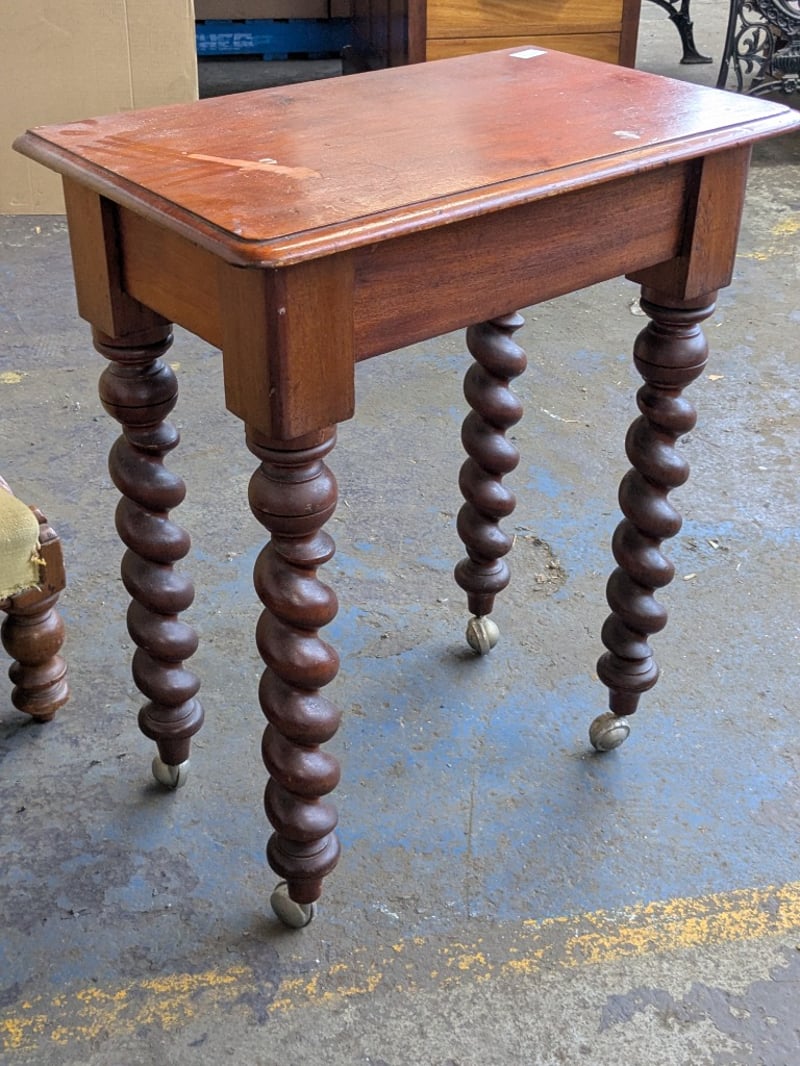 Furniture, including leather armchair, antique style wooden side table with bobbin twist legs and casters and more Sold as lot