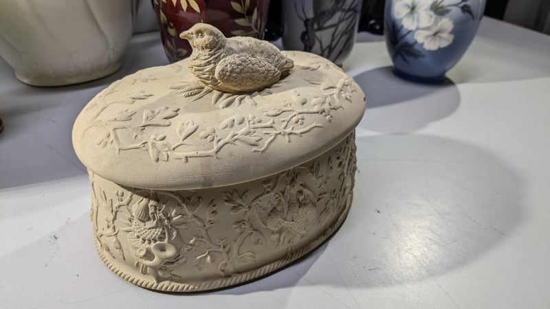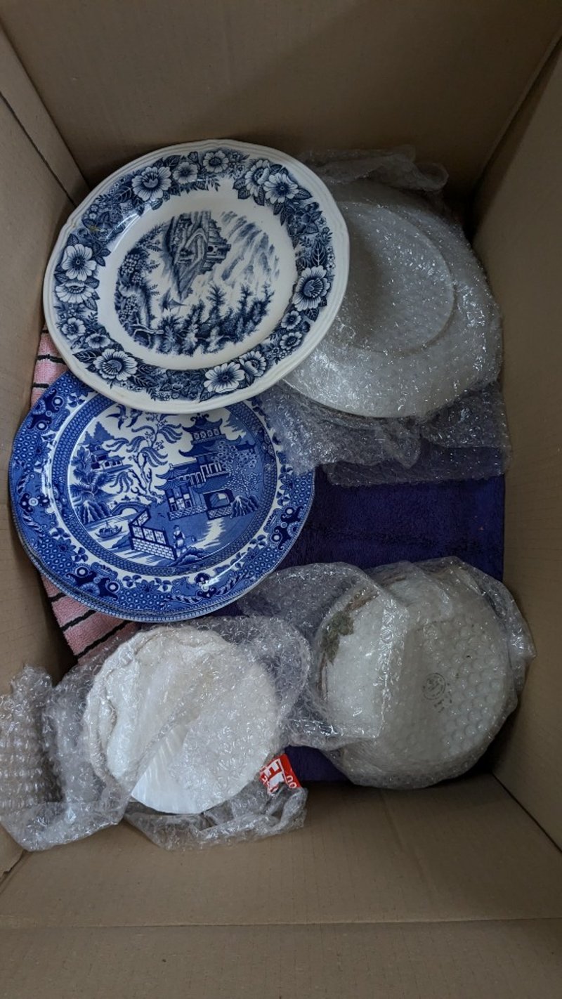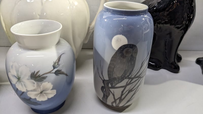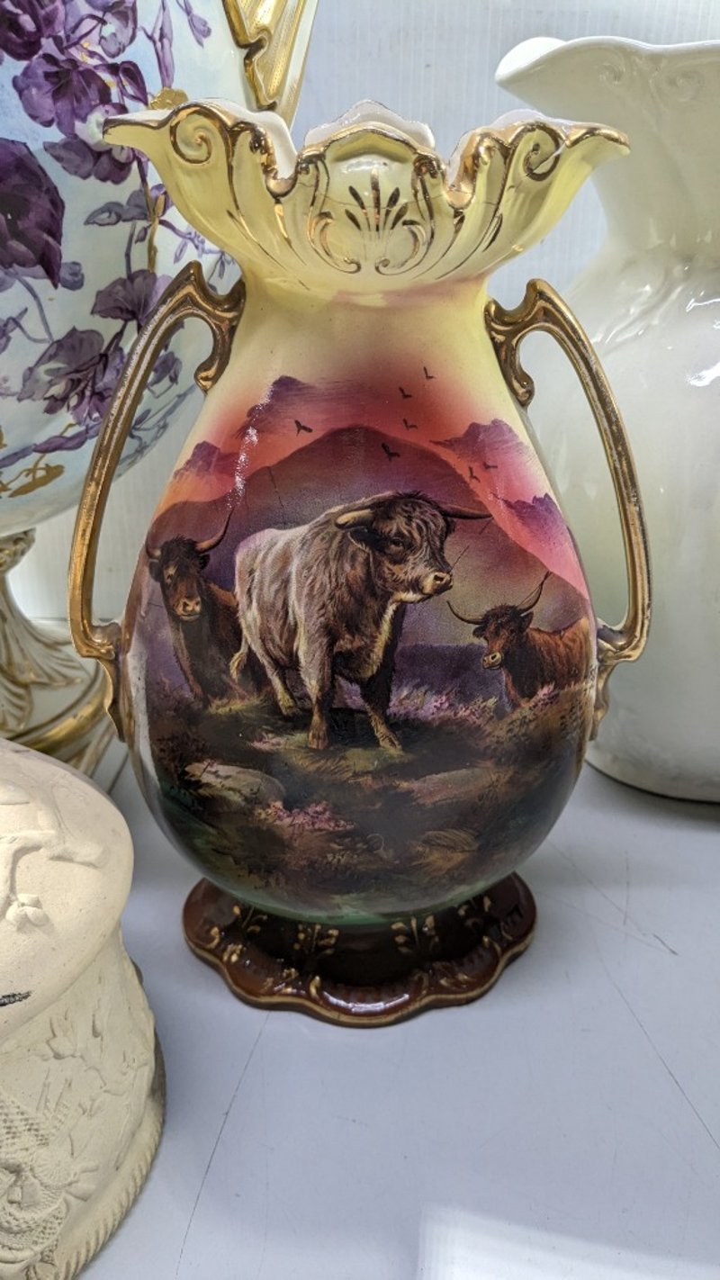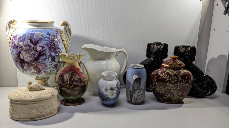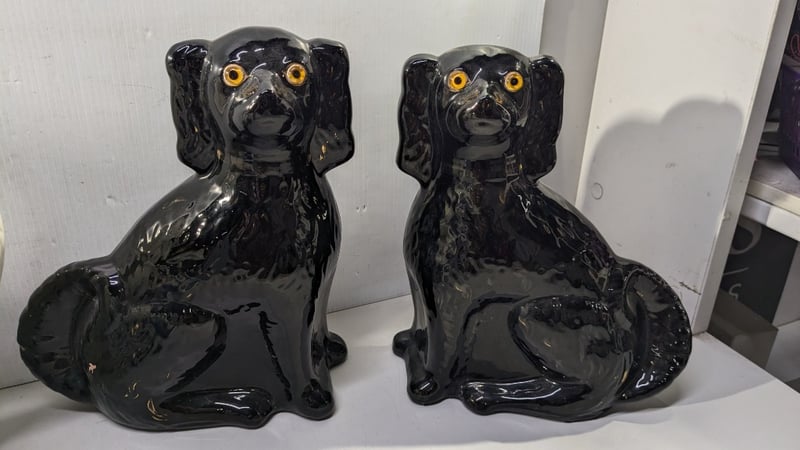 Homewares, including decorative plates and vase, pair of black Staffordshire spaniel dog figurines and more
