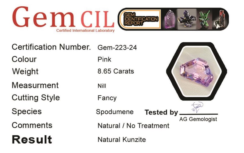 8.65 CARATS NATURAL QUALITY PURPLISH-PINK KUNZITE 8.65 Carats Natural Quality Purplish-Pink Kunzite Stone = Natural KunziteWeight = 8.65 Carats Colour = Purplish-PinkCut = Fancy Lustre = ExcellentNote = Gem Cil, Certified, Precise Custom Cut (Not Commercial) Condition: Good - Refer Images 0488336+24