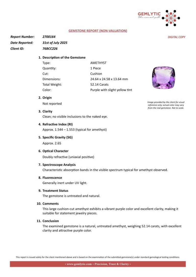 Conclusion: The Examined Gemstone Is A Natural, Untreated Amethyst, Weighing 52.14 Carats, With Excellent Clarity And Attractive Purple Color.