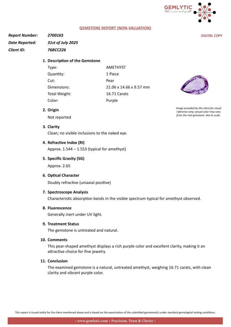 Conclusion: The Examined Gemstone Is A Natural, Untreated Amethyst, Weighing 16.71 Carats, With Clean Clarity And Vibrant Purple Color.