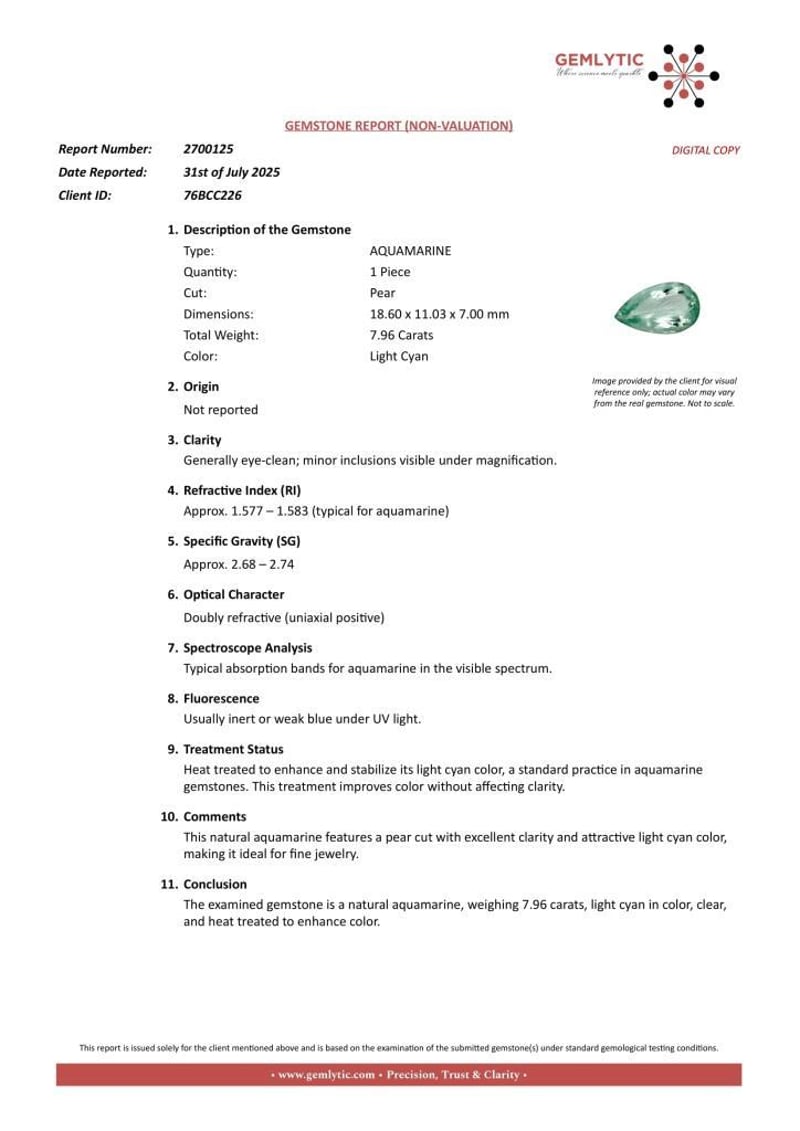 Conclusion: The Examined Gemstone Is A Natural Aquamarine, Weighing 7.96 Carats, Light Cyan In Color, Clear, And Heat Treated To Enhance Color.