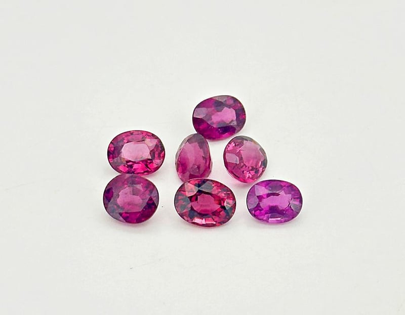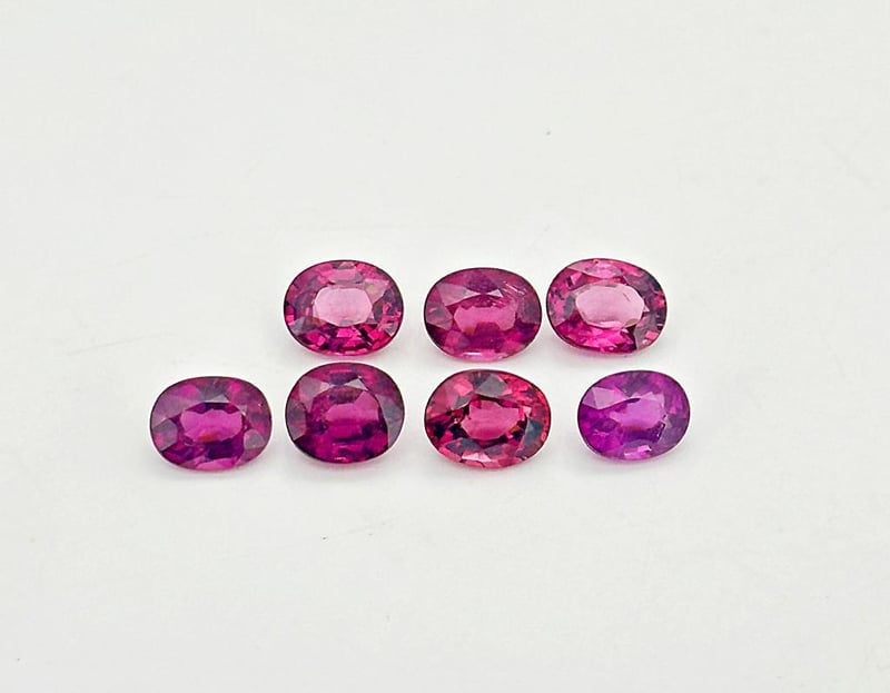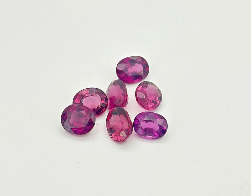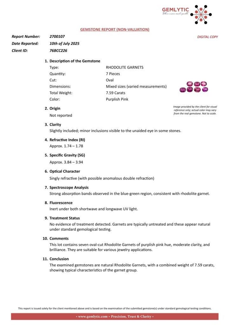 RHODOLITE GARNETS - 7.59 CARATS - PURPLISH PINK Quantity: 7 PcsReport Number: 2700107Clarity: Slightly Included; Minor Inclusions Visible To The Unaided Eye In Some Stones.Measurements: Mixed SizesTreatments: No Evidence Of Treatment Detected. Garnets Are Typically Untreated And These Appear Natural Under Standard Gemological Testing.Origin: Not ReportedRefractive Index: Approx. 1.74 – 1.78Specific Gravity: Approx. 3.84 – 3.94Spectroscope Analysis: Strong Absorption Bands Observed In The Blue-Green Region, Consistent With Rhodolite Garnet.Fluorescence: Inert Under Both Shortwave And Longwave Uv Light.Comments: This Lot Contains Seven Oval-Cut Rhodolite Garnets Of Purplish Pink Hue, Moderate Clarity, And Brilliance. They Are Suitable For Various Jewelry Applications.Conclusion: The Examined Gemstones Are Natural Rhodolite Garnets, With A Combined Weight Of 7.59 Carats, Showing Typical Characteristics Of The Garnet Group. 0+3