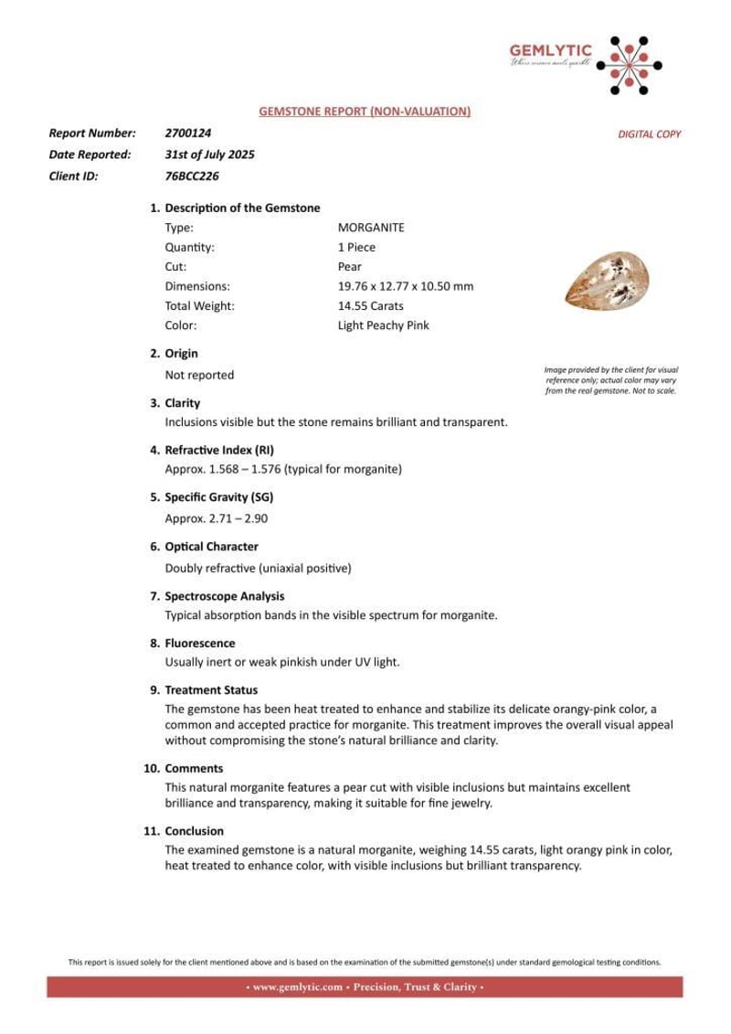Conclusion: The Examined Gemstone Is A Natural Morganite, Weighing 14.55 Carats, Light Orangy Pink In Color, Heat Treated To Enhance Color, With Visible Inclusions But Brilliant Transparency.