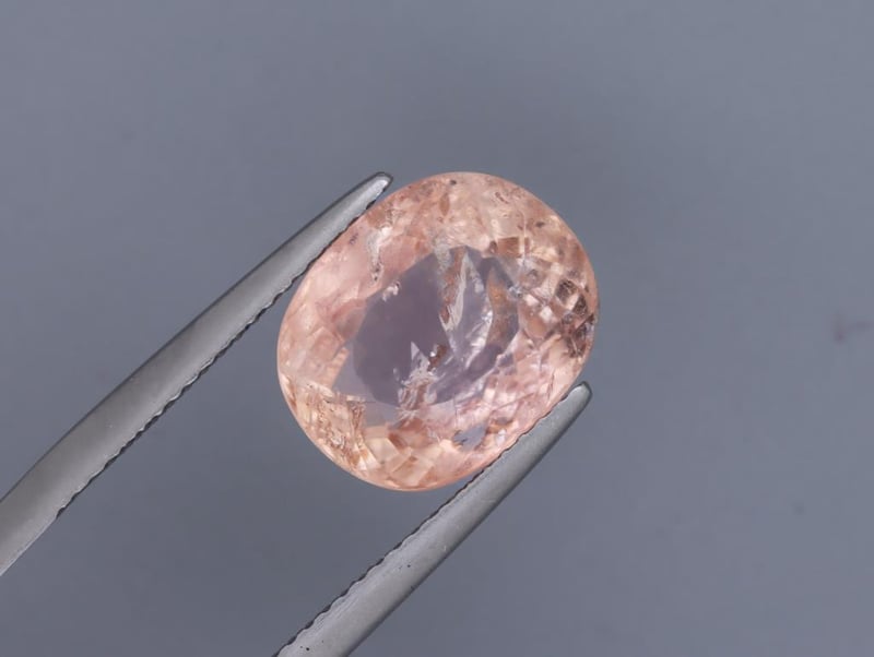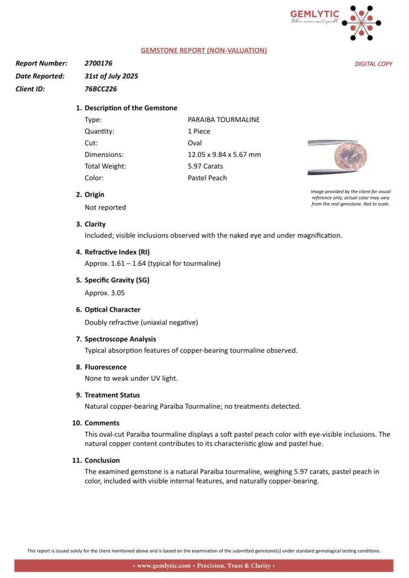 Conclusion: The Examined Gemstone Is A Natural Paraiba Tourmaline, Weighing 5.97 Carats, Pastel Peach In Color, Included With Visible Internal Features, And Naturally Copper-Bearing.