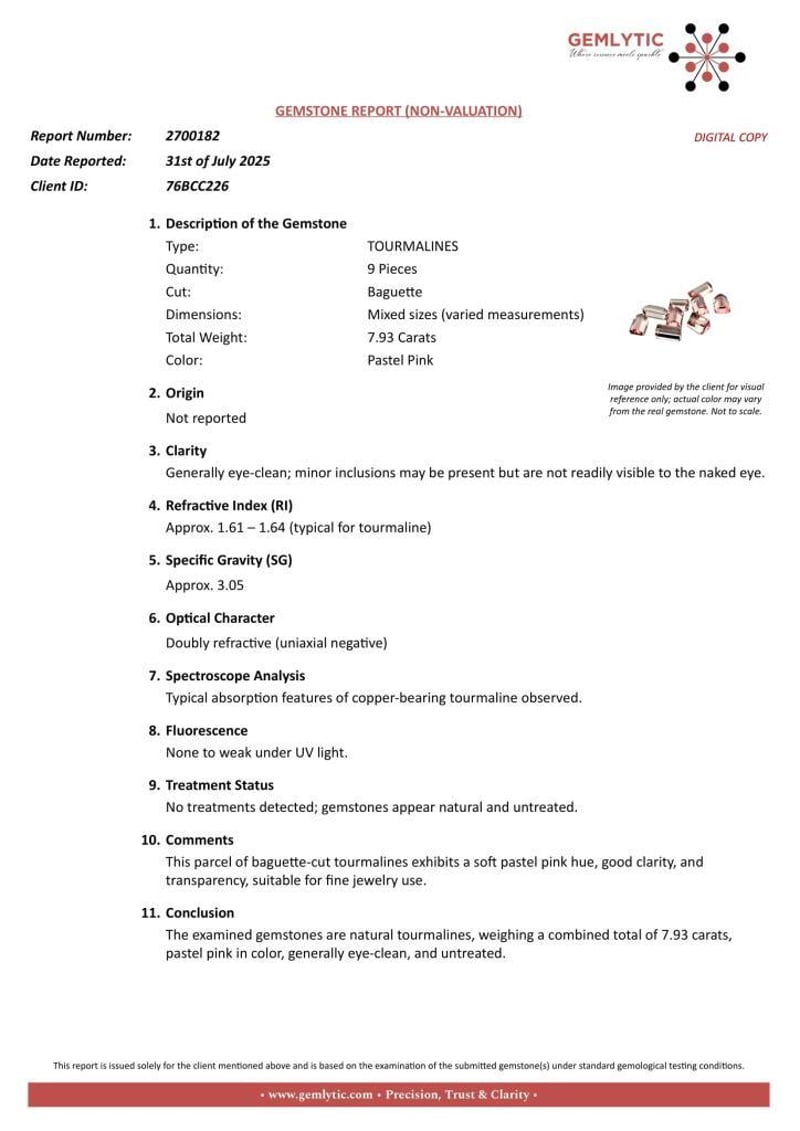 Conclusion: The Examined Gemstones Are Natural Tourmalines, Weighing A Combined Total Of 7.93 Carats, Pastel Pink In Color, Generally Eye-Clean, And Untreated.