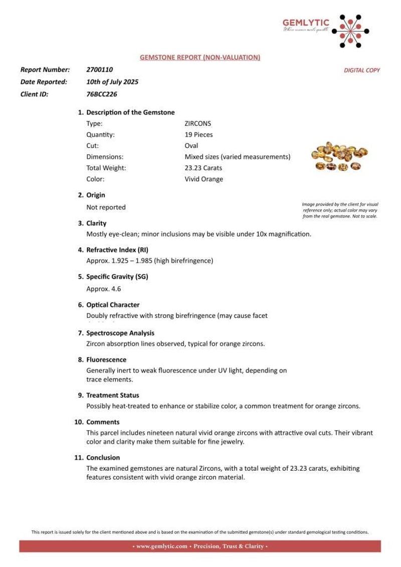 Conclusion: The Examined Gemstones Are Natural Zircons, With A Total Weight Of 23.23 Carats, Exhibiting Features Consistent With Vivid Orange Zircon Material.