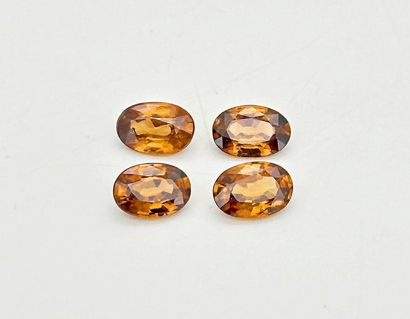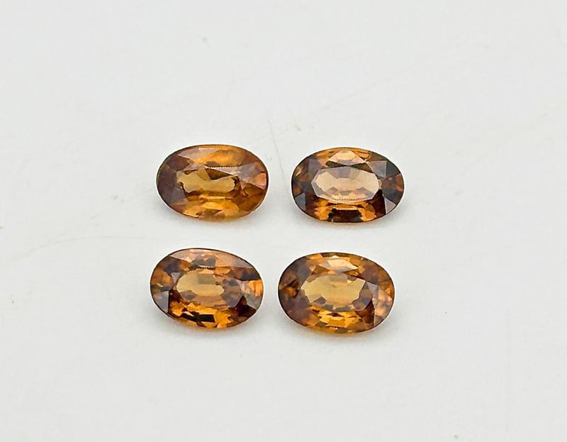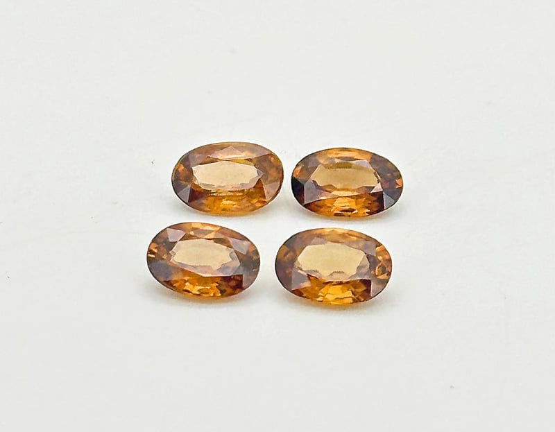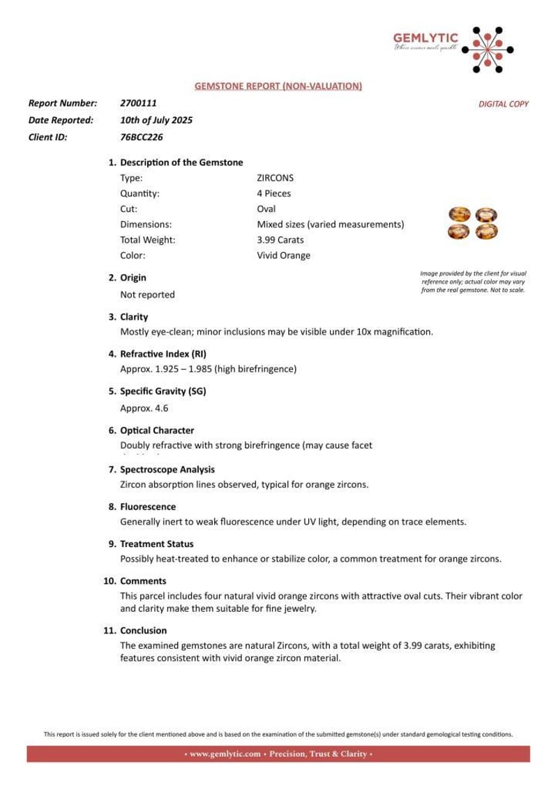 ZIRCONS - 3.99 CARATS - VIVID ORANGE Quantity: 4 PcsReport Number: 2700111Clarity: Mostly Eye-Clean; Minor Inclusions May Be Visible Under 10X Magnification.Measurements: Mixed SizesTreatments: Possibly Heat-Treated To Enhance Or Stabilize Color, A Common Treatment For Orange Zircons.Origin: Not ReportedRefractive Index: Approx. 1.925 – 1.985 (High Birefringence)Specific Gravity: Approx. 4.6Spectroscope Analysis: Zircon Absorption Lines Observed, Typical For Orange Zircons.Fluorescence: Generally Inert To Weak Fluorescence Under Uv Light, Depending On Trace Elements.Comments: This Parcel Includes Four Natural Vivid Orange Zircons With Attractive Oval Cuts. Their Vibrant Color And Clarity Make Them Suitable For Fine Jewelry.Conclusion: The Examined Gemstones Are Natural Zircons, With A Total Weight Of 3.99 Carats, Exhibiting Features Consistent With Vivid Orange Zircon Material. 0+7