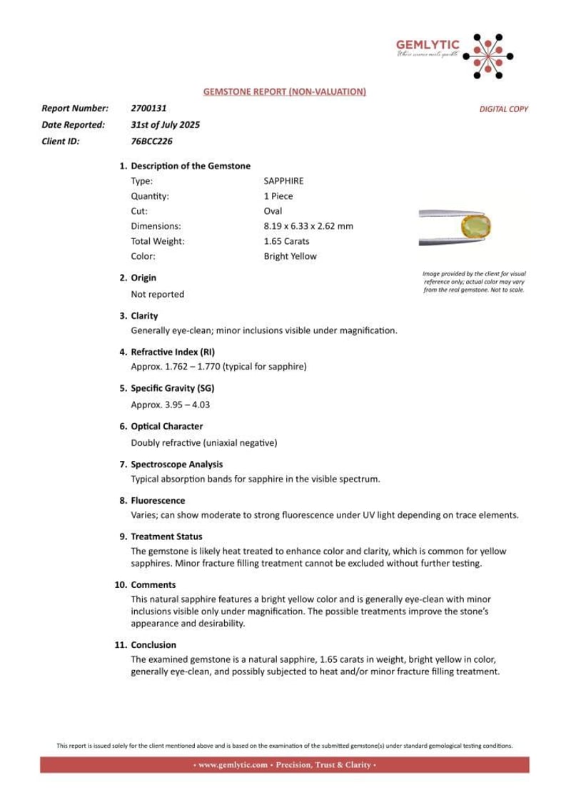 Conclusion: The Examined Gemstone Is A Natural Sapphire, 1.65 Carats In Weight, Bright Yellow In Color, Generally Eye-Clean, And Possibly Subjected To Heat And/Or Minor Fracture Filling Treatment.