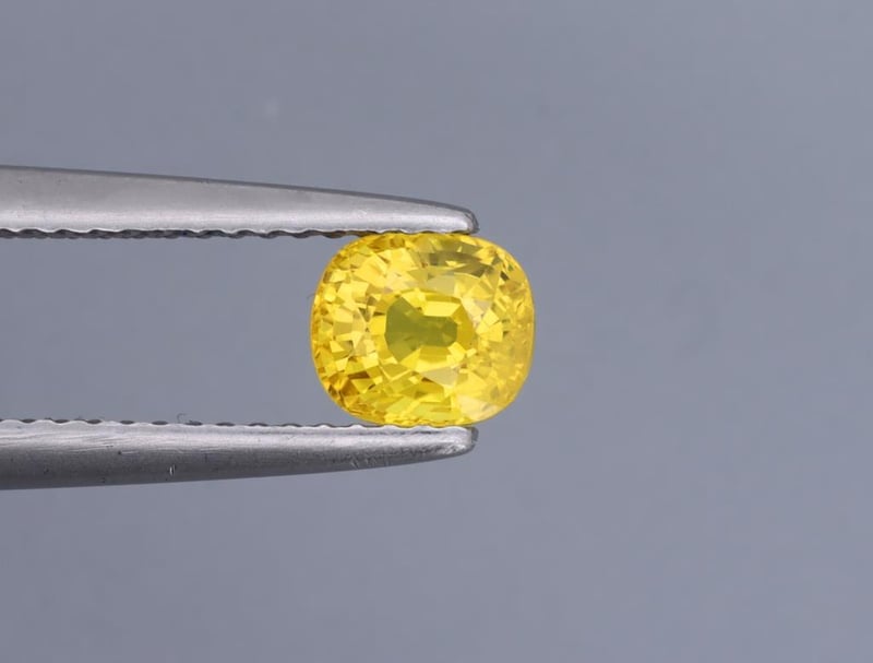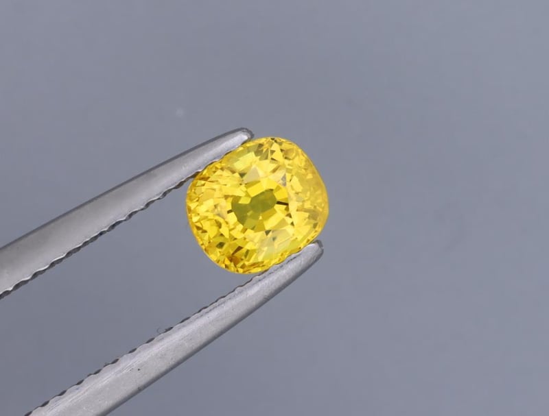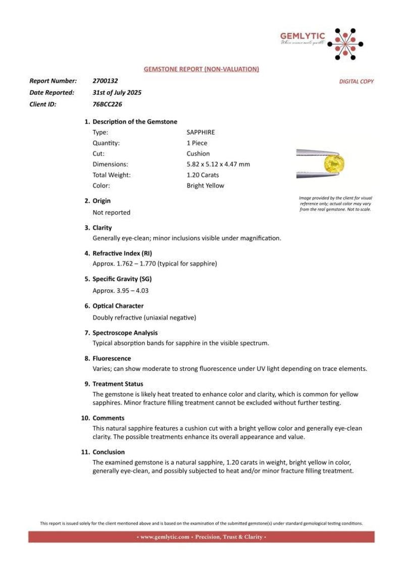 SAPPHIRE - 1.20 CARATS - BRIGHT YELLOW Quantity: 1 PcsReport Number: 2700132Clarity: Generally Eye-Clean; Minor Inclusions Visible Under Magnification.Measurements: 5.82 X 5.12 X 4.47Treatments: The Gemstone Is Likely Heat Treated To Enhance Color And Clarity, Which Is Common For Yellow Sapphires. Minor Fracture Filling Treatment Cannot Be Excluded Without Further Testing.Origin: Not ReportedRefractive Index: Approx. 1.762 – 1.770 (Typical For Sapphire)Specific Gravity: Approx. 3.95 – 4.03Spectroscope Analysis: Typical Absorption Bands For Sapphire In The Visible Spectrum.Fluorescence: Varies; Can Show Moderate To Strong Fluorescence Under Uv Light Depending On Trace Elements.Comments: This Natural Sapphire Features A Cushion Cut With A Bright Yellow Color And Generally Eye-Clean Clarity. The Possible Treatments Enhance Its Overall Appearance And Value.Conclusion: The Examined Gemstone Is A Natural Sapphire, 1.20 Carats In Weight, Bright Yellow In Color, Generally Eye-Clean, And Possibly Subjected To Heat And/Or Minor Fracture Filling Treatment. 0+28