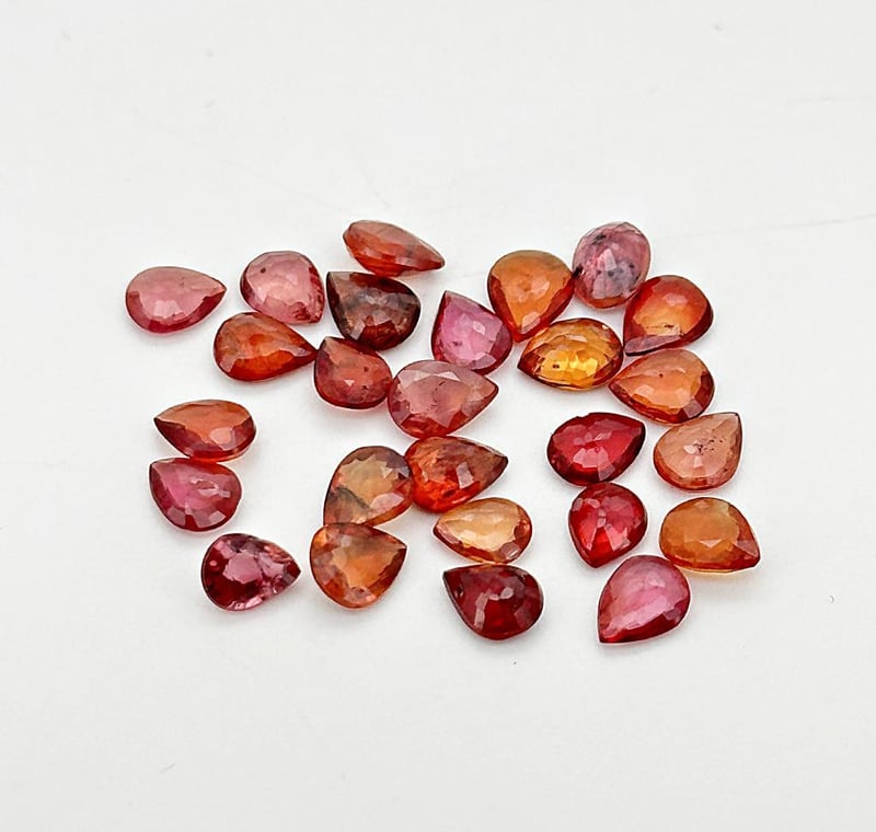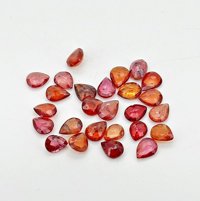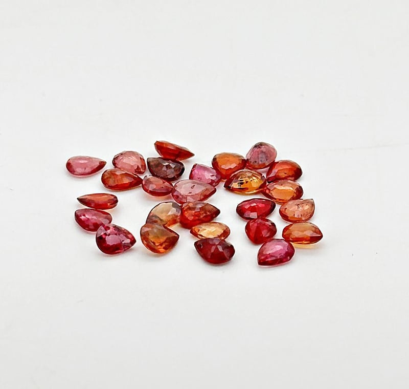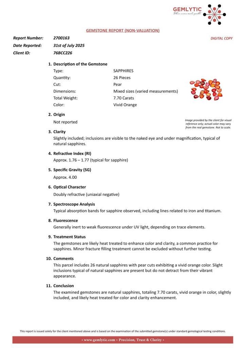 SAPPHIRES - 7.70 CARATS - VIVID ORANGE Quantity: 26 PcsReport Number: 2700163Clarity: Slightly Included; Inclusions Are Visible To The Naked Eye And Under Magnification, Typical Of Natural Sapphires.Measurements: Mixed SizesTreatments: The Gemstones Are Likely Heat Treated To Enhance Color And Clarity, A Common Practice For Sapphires. Minor Fracture Filling Treatment Cannot Be Excluded Without Further Testing.Origin: Not ReportedRefractive Index: Approx. 1.76 – 1.77 (Typical For Sapphire)Specific Gravity: Approx. 4.00Spectroscope Analysis: Typical Absorption Bands For Sapphire Observed, Including Lines Related To Iron And Titanium.Fluorescence: Generally Inert To Weak Fluorescence Under Uv Light, Depending On Trace Elements.Comments: This Parcel Includes 26 Natural Sapphires With Pear Cuts Exhibiting A Vivid Orange Color. Slight Inclusions Typical Of Natural Sapphires Are Present But Do Not Detract From Their Vibrant Appearance.Conclusion: The Examined Gemstones Are Natural Sapphires, Totaling 7.70 Carats, Vivid Orange In Color, Slightly Included, And Likely Heat Treated For Color And Clarity Enhancement. 0+59