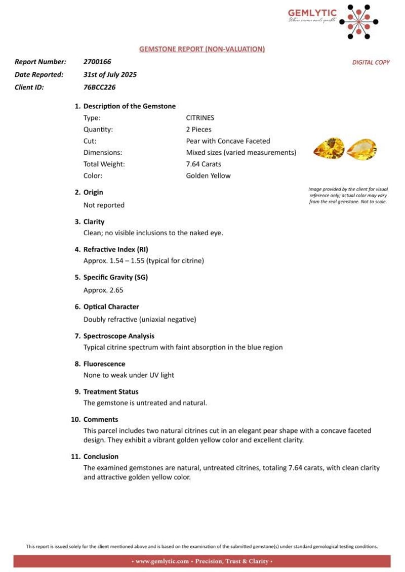 Conclusion: The Examined Gemstones Are Natural, Untreated Citrines, Totaling 7.64 Carats, With Clean Clarity And Attractive Golden Yellow Color.