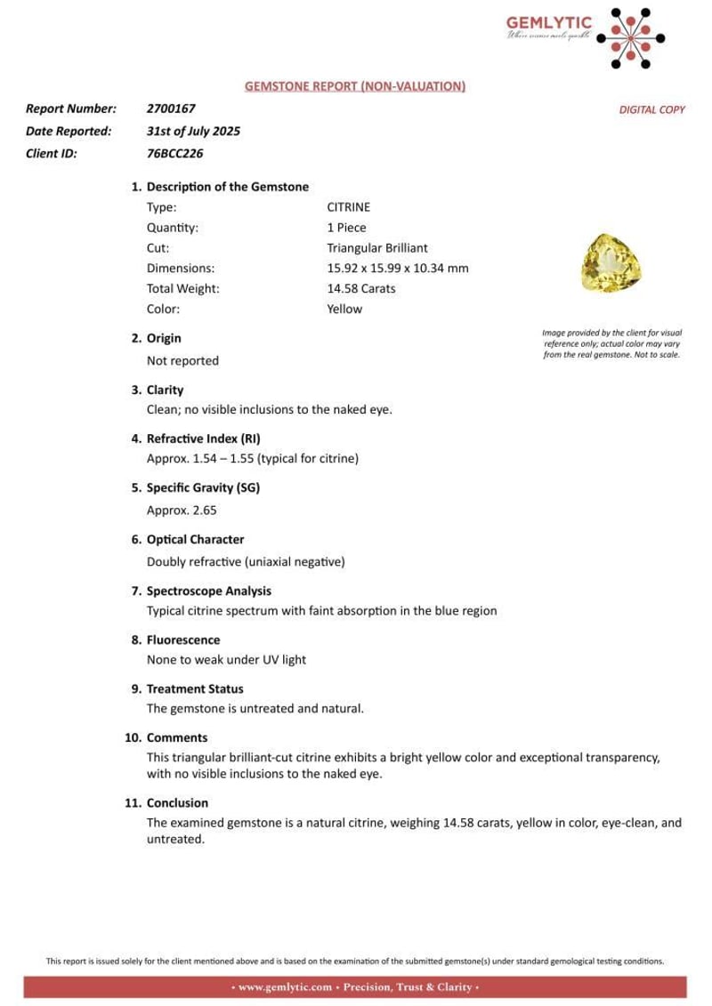 Conclusion: The Examined Gemstone Is A Natural Citrine, Weighing 14.58 Carats, Yellow In Color, Eye-Clean, And Untreated.