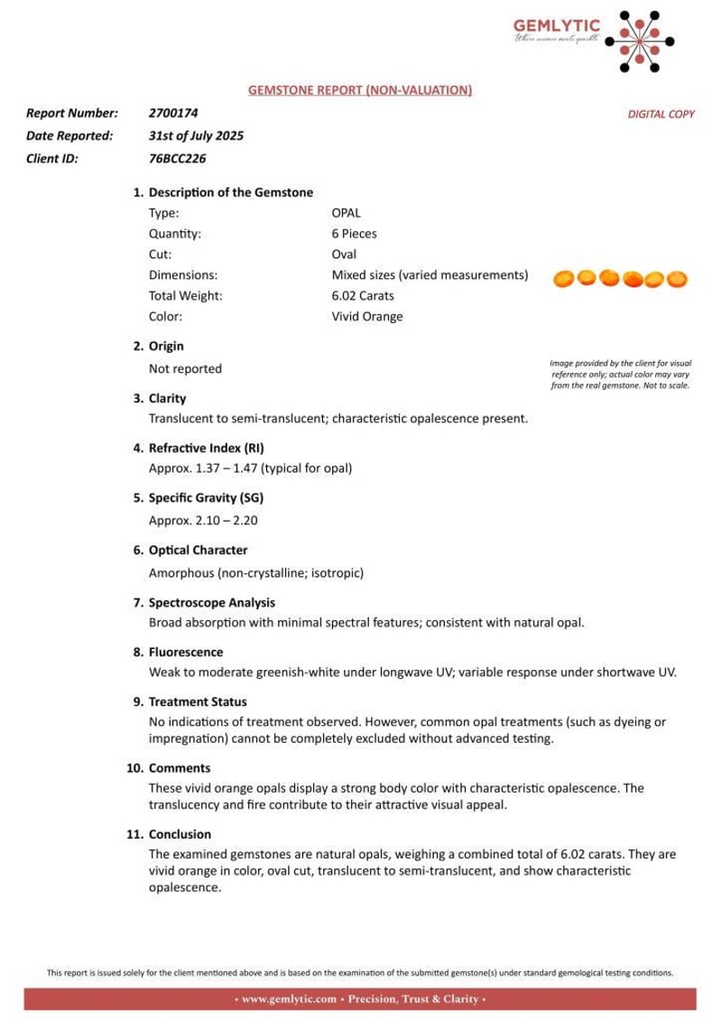 Conclusion: The Examined Gemstones Are Natural Opals, Weighing A Combined Total Of 6.02 Carats. They Are Vivid Orange In Color, Oval Cut, Translucent To Semi-Translucent, And Show Characteristic Opalescence.