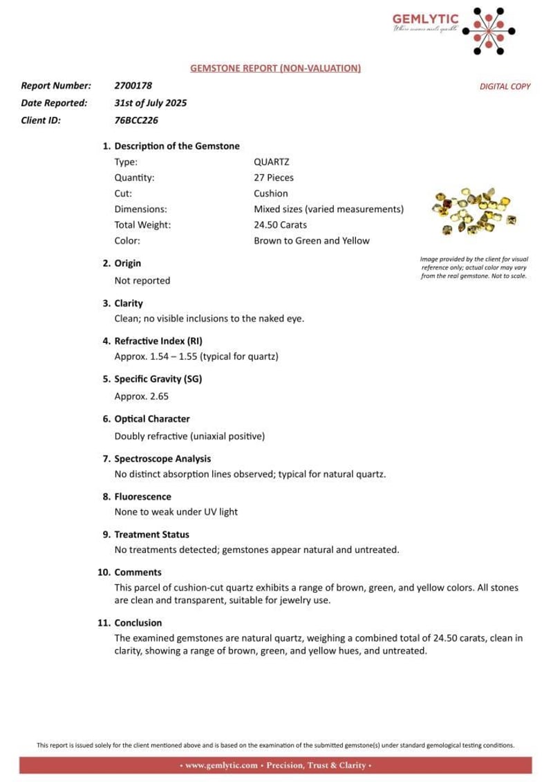 Conclusion: The Examined Gemstones Are Natural Quartz, Weighing A Combined Total Of 24.50 Carats, Clean In Clarity, Showing A Range Of Brown, Green, And Yellow Hues, And Untreated.