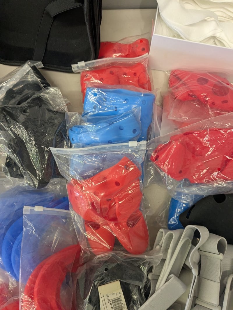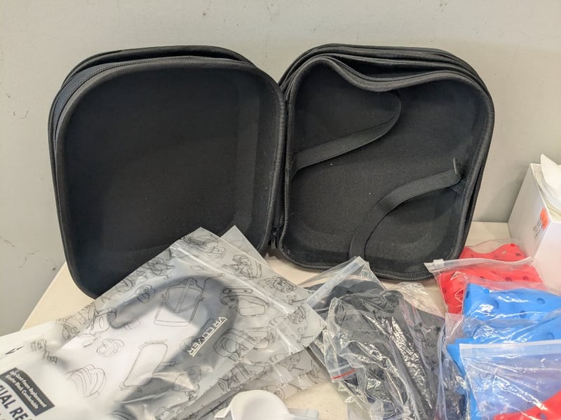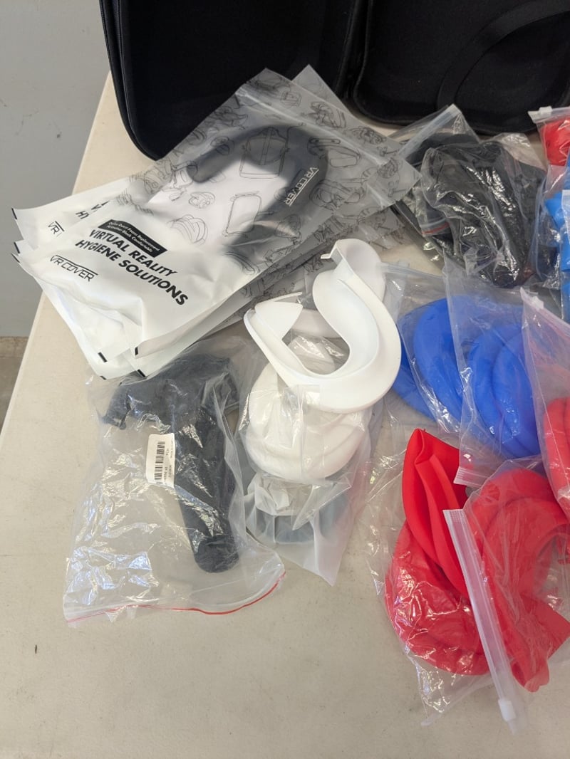 Assorted VR Headset Accessories, Includes: multiple VR face gasket covers, silicone controller skins, replacement head straps, adjustable bands, protective storage cases, hygiene covers, and assorted VR accessory parts in red, blue, white, and black.