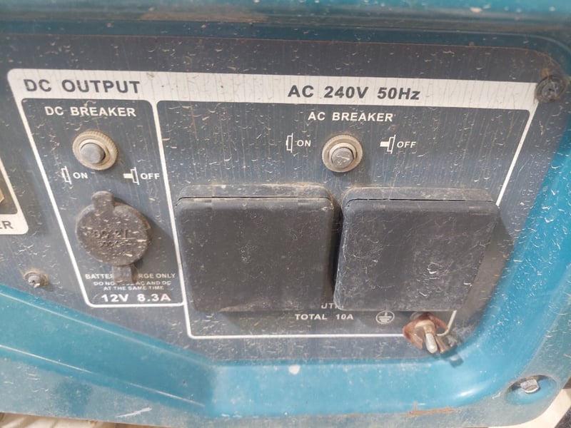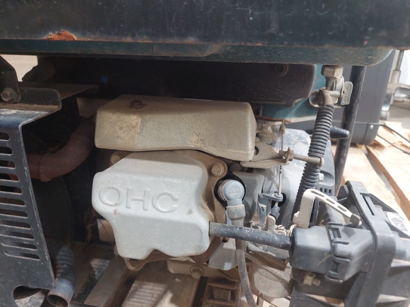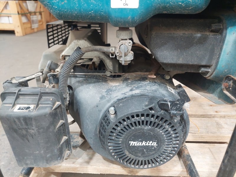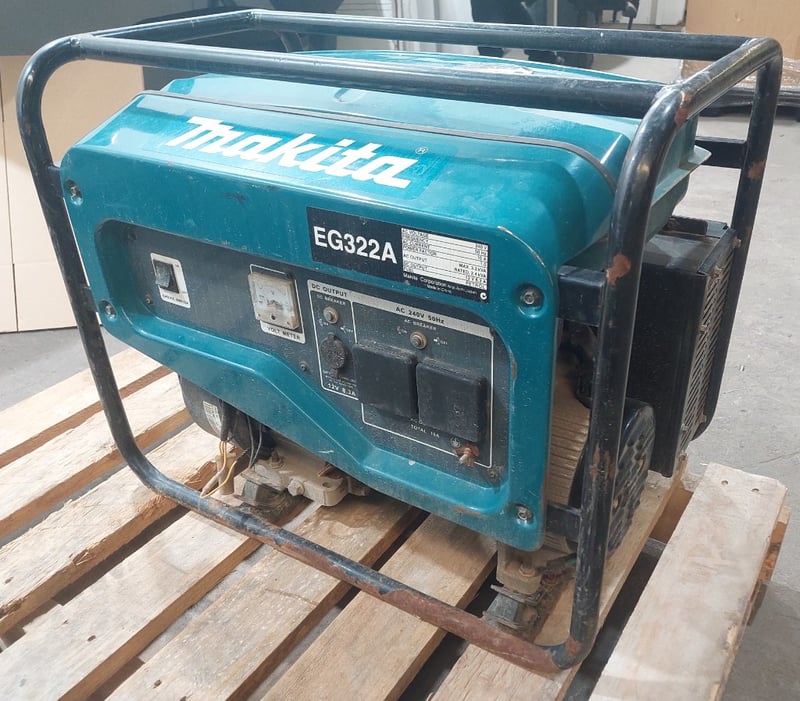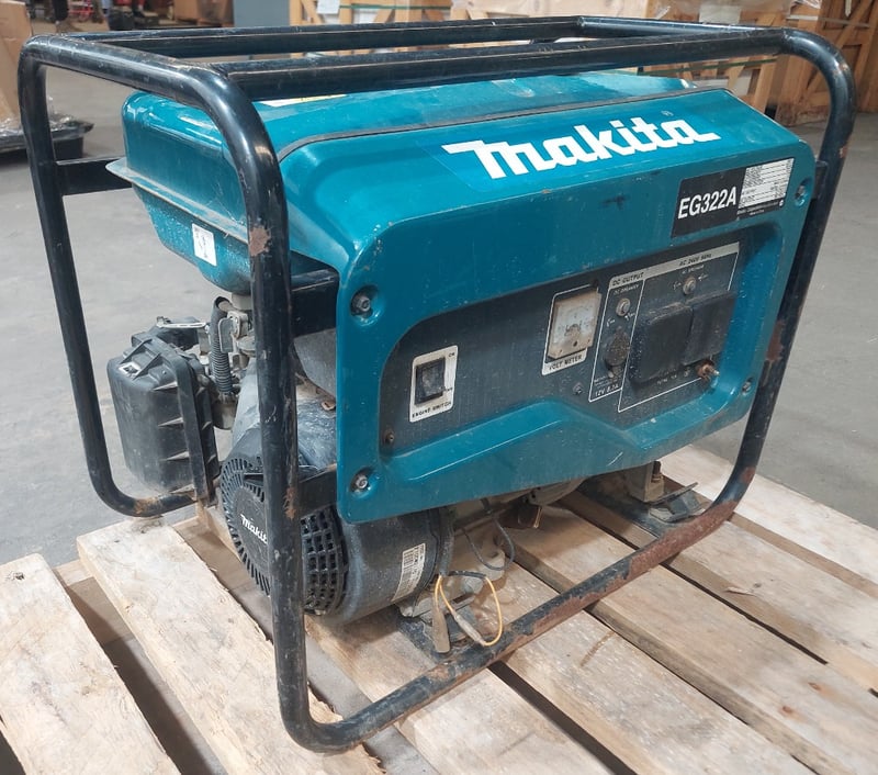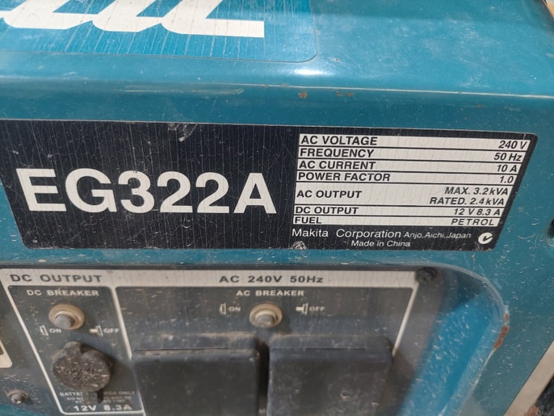 Petrol generator Makita brand. Dims: 54cm H, 41cm W, 61cm D. Model:EG322A. Notes: item untested and signs of wear.