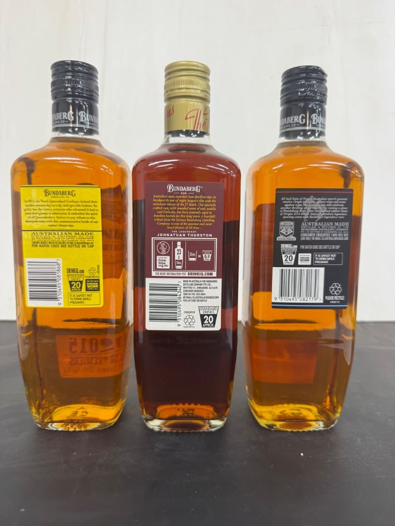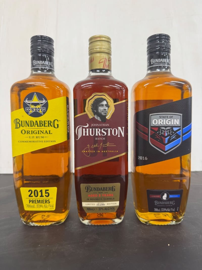 Bundaberg Rum Johnathan Thurston #26490Cowboys 2015 premiersState of Origin 2016(3x700ml bottles) ABV 37%SOLD AS LOT