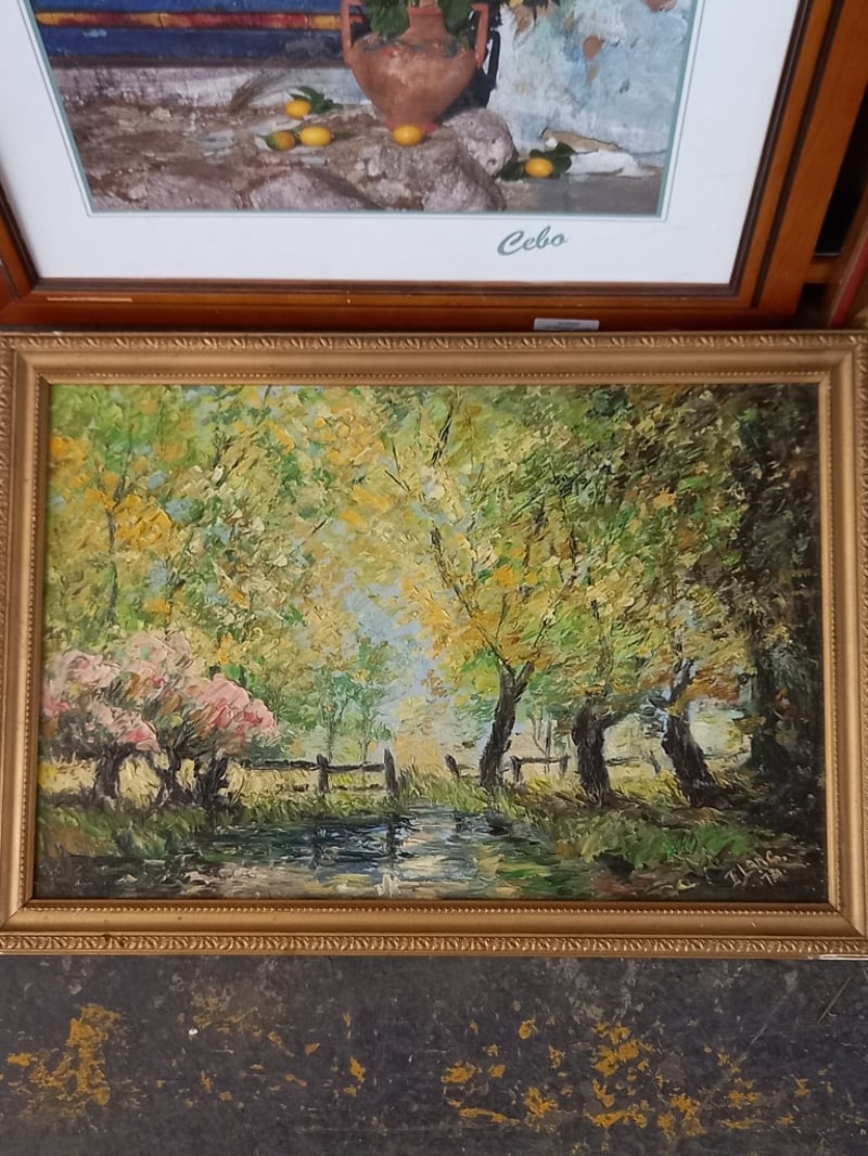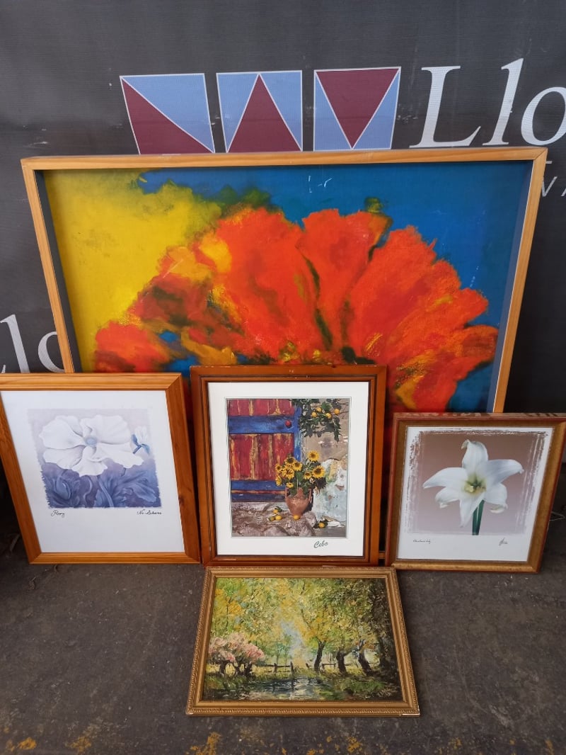Art, assorted framed paintings and prints, including flowers and landscape.