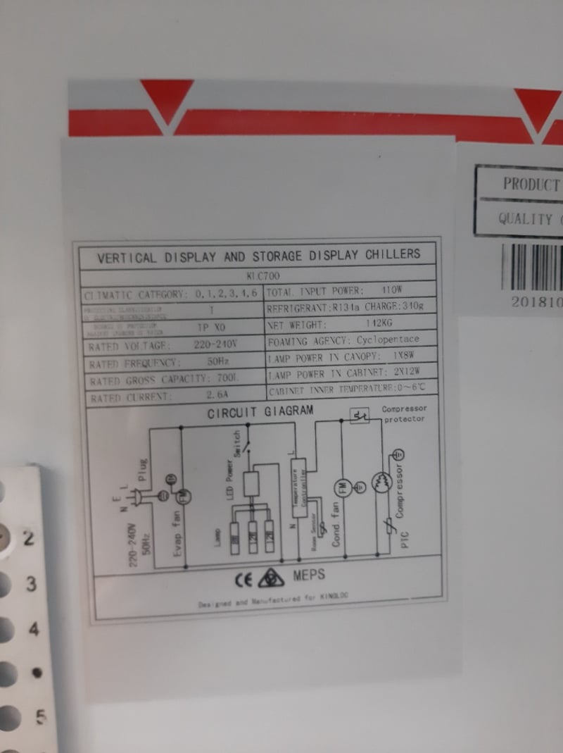 Kingloc upright fridge - Model no: KLC700, Serial # 201810KLC7000017