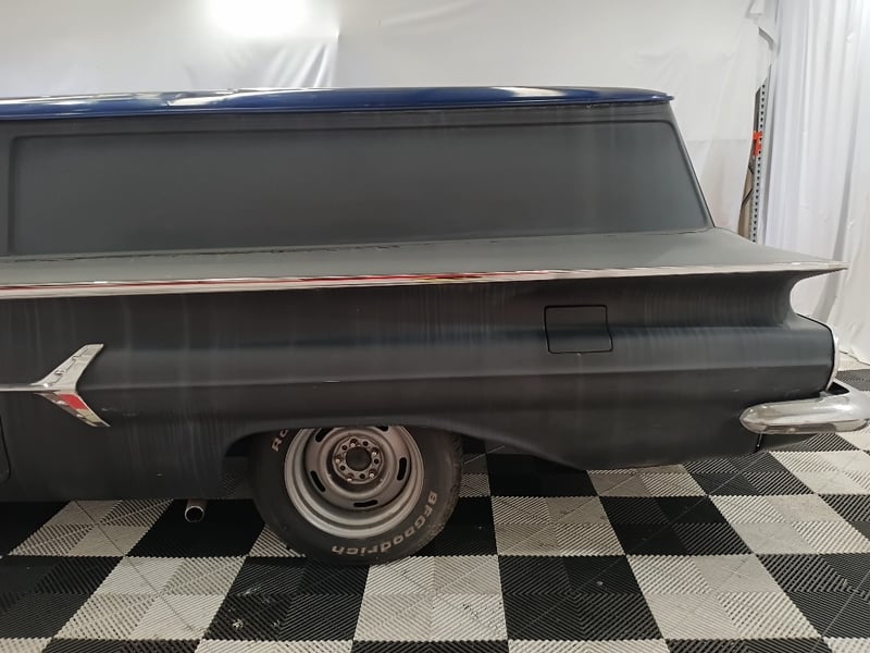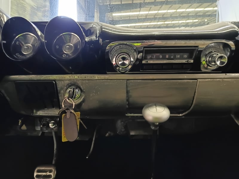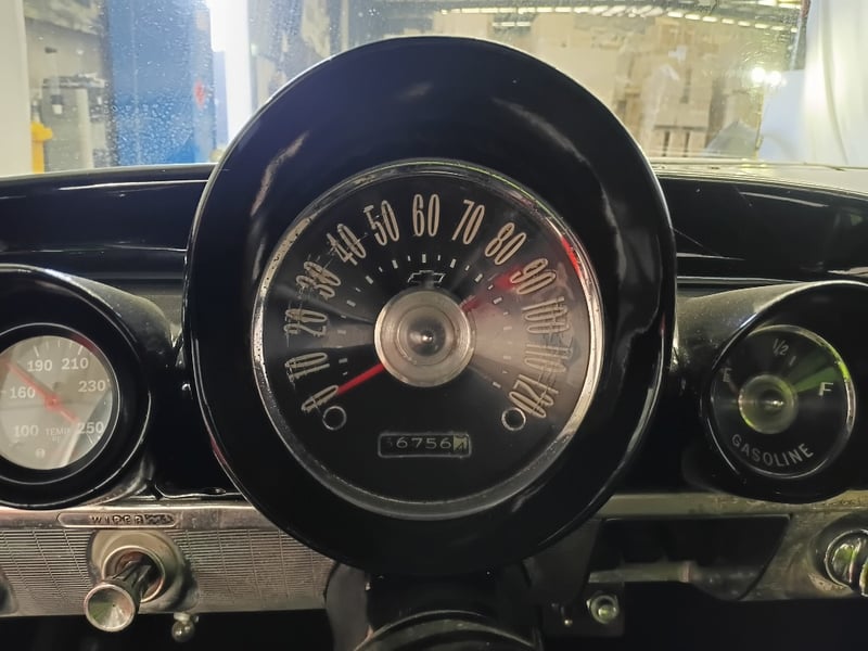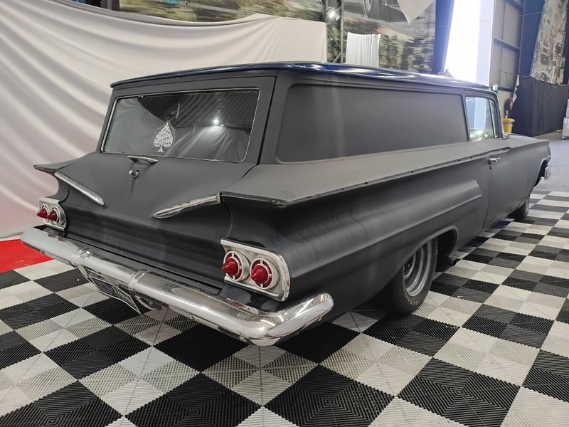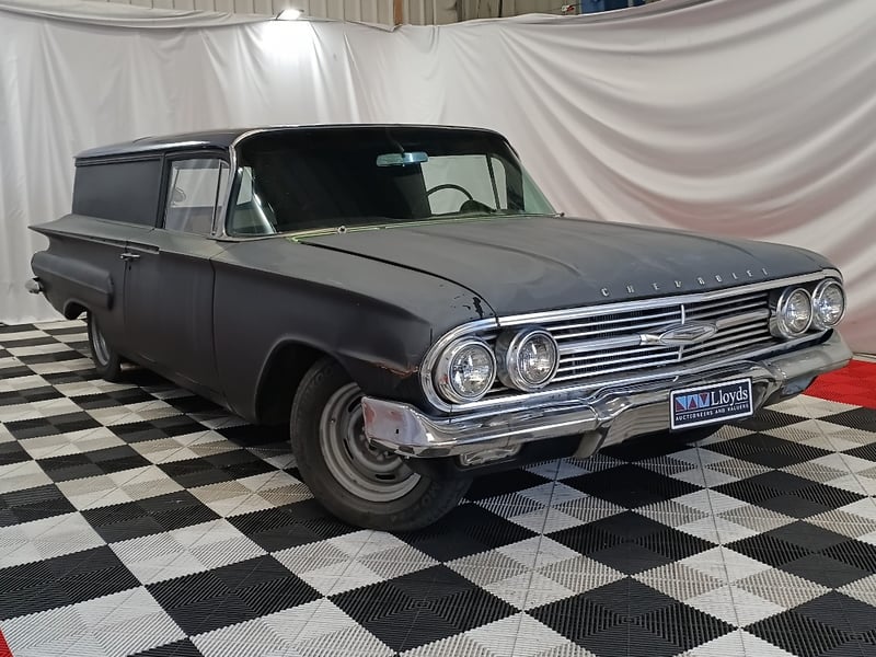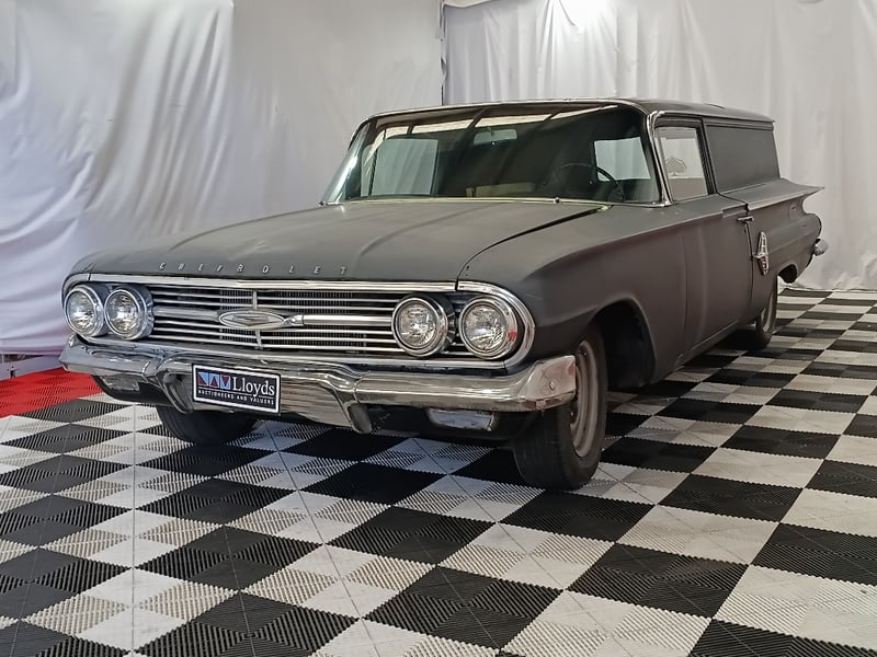 1960 Chevrolet Delivery two‑door vehicle finished in black. Left‑hand drive configuration powered by a V8 petrol engine. Odometer indicating 36,756 miles. Seating for three.