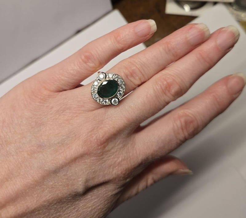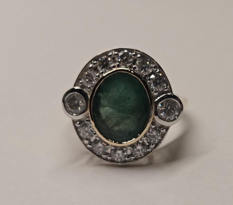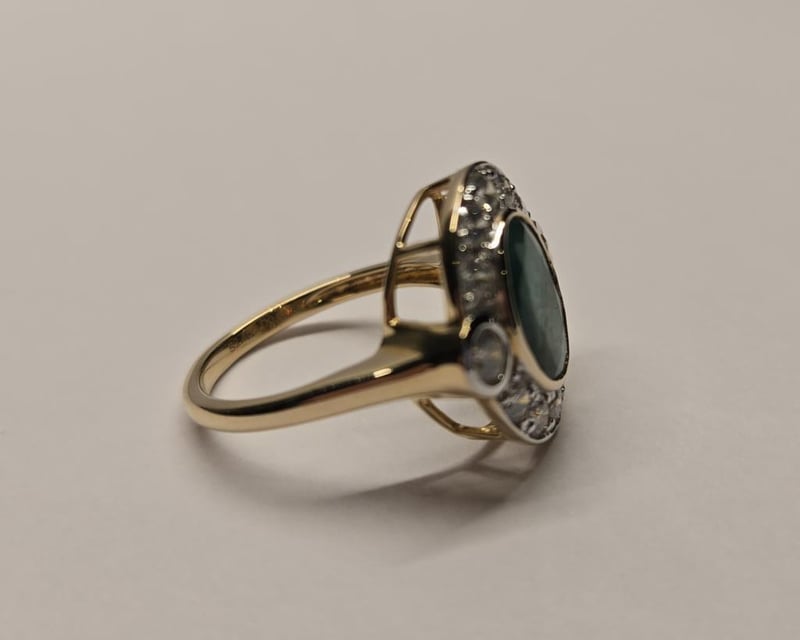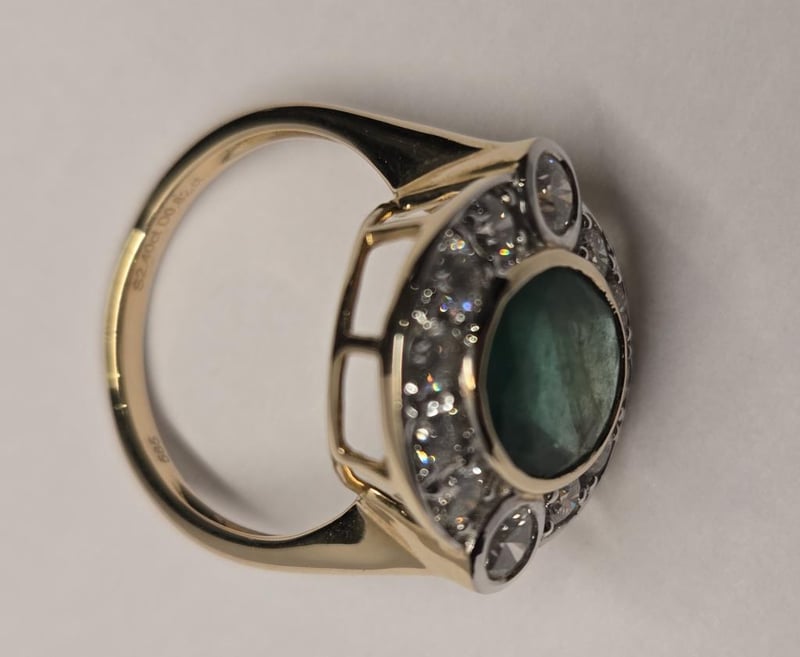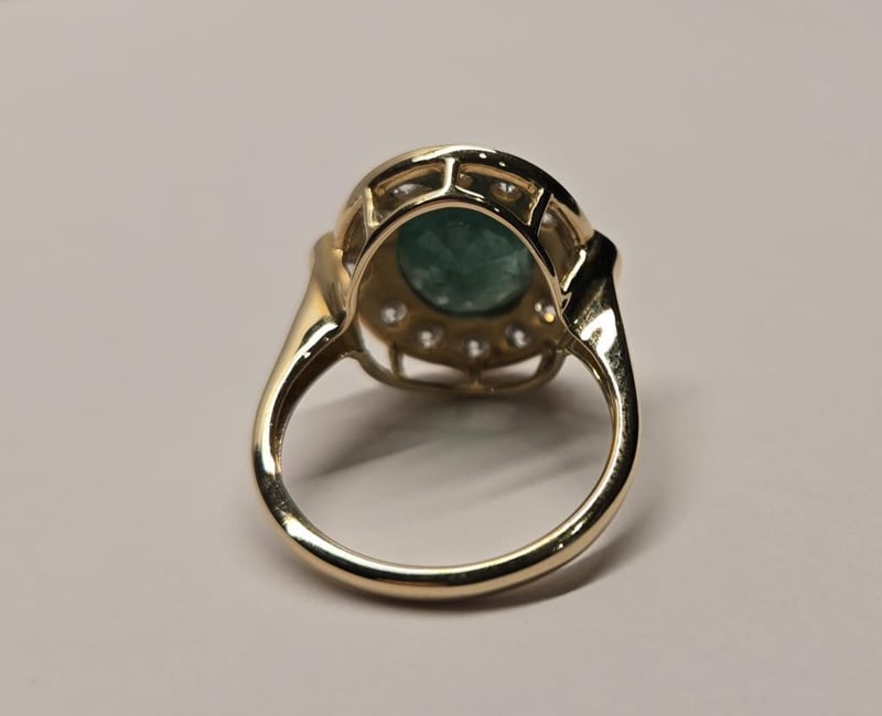 14K YELLOW GOLD RING WITH EMERALD & DIAMOND Total Item Weight: 4.3gms 14K Yellow Gold Ring With Central Oval Shaped Emerald And 12 Diamonds. Approx Size MMarkings: Inside band marked 585 S2.40ct D0.82ct Condition: Fair - Refer Images 0+3
