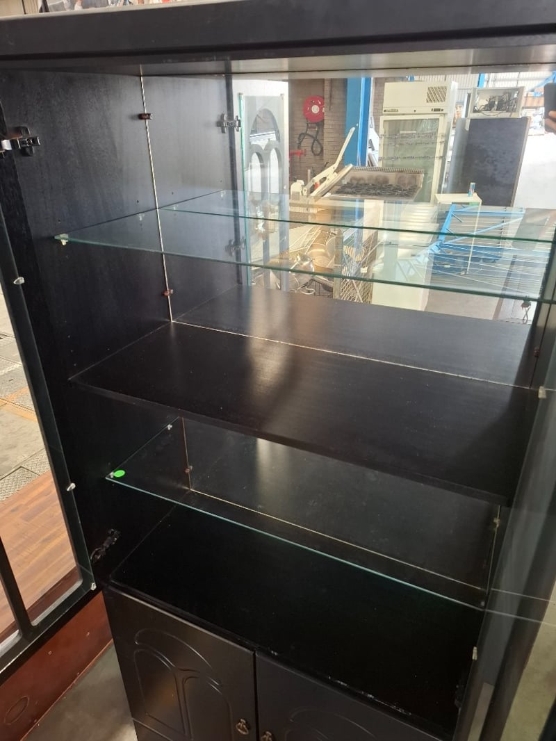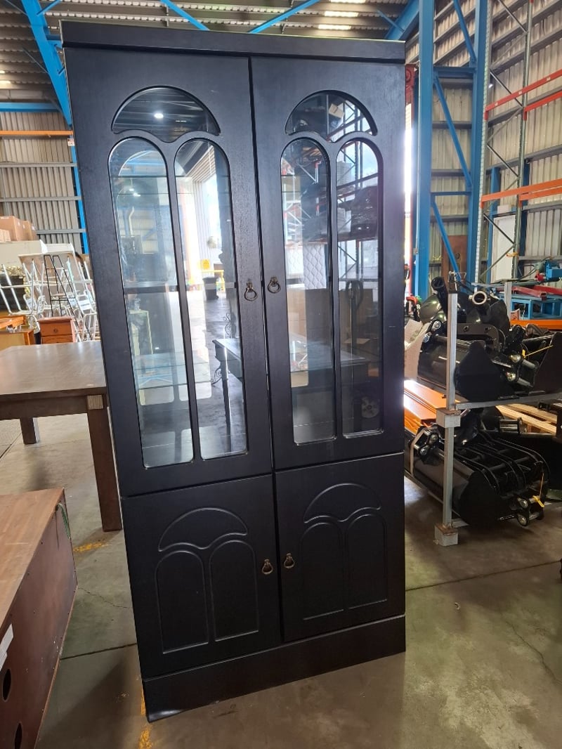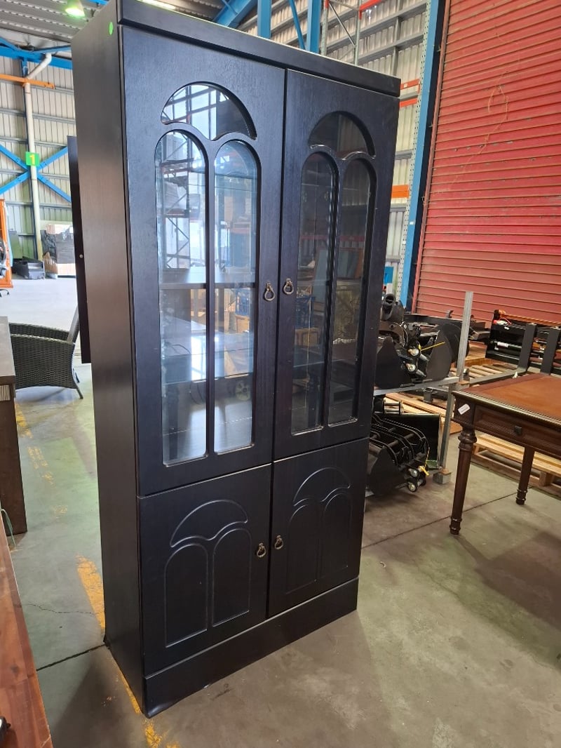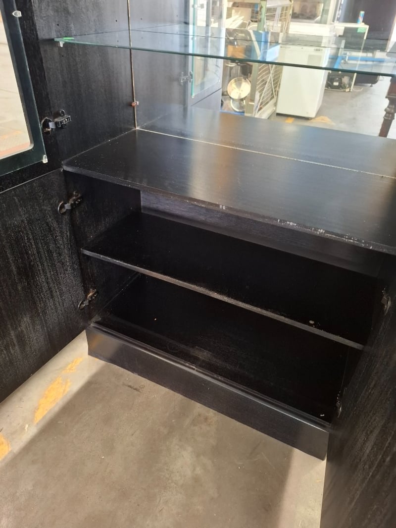 Black wooden display cabinet with glass and lower doors. Dimensions: 89 cm W x 39 cm D x 193 cm H NOTE: VISIBLE DAMAGES ON BACK LOWER SIDE ,
