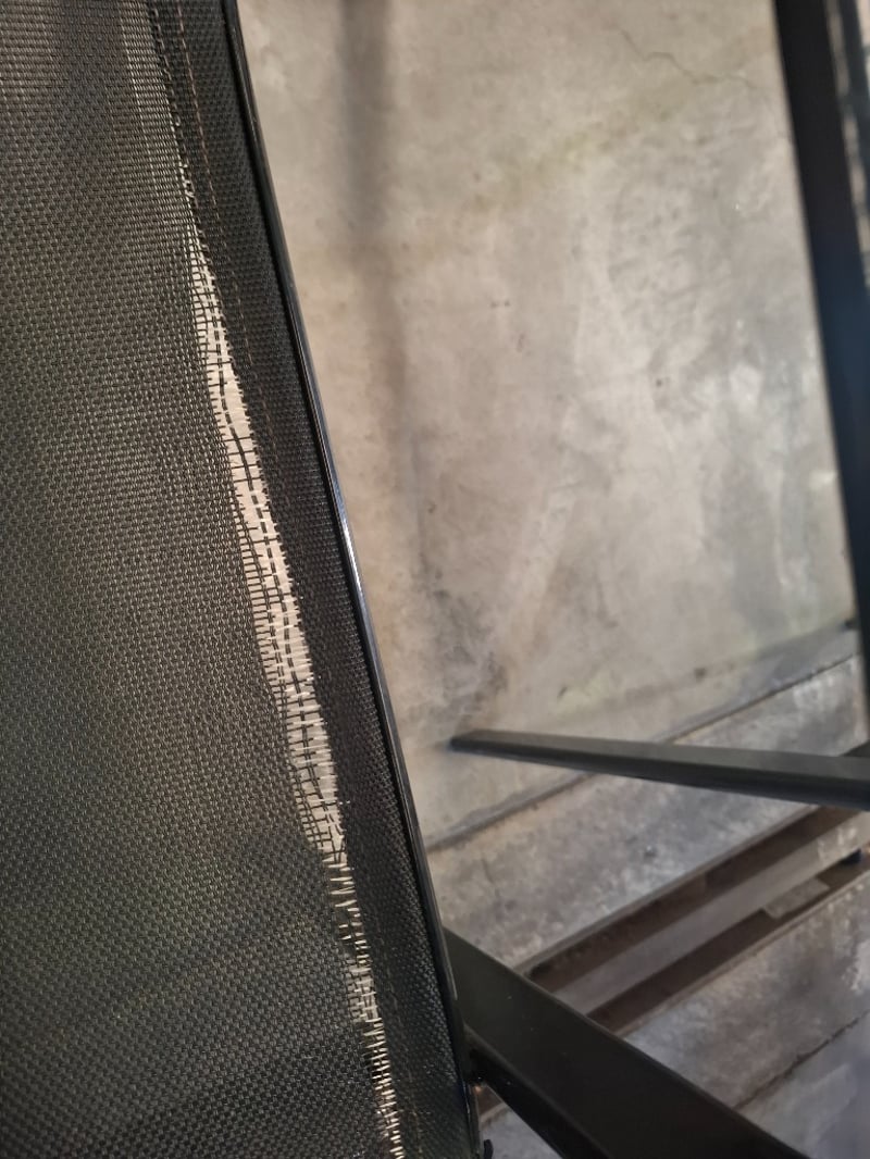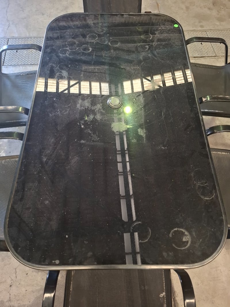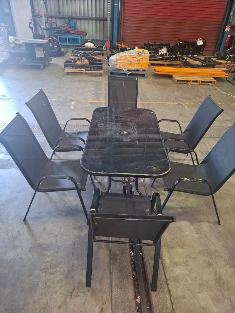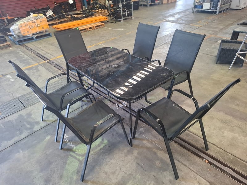 Black aluminium Outdoor table top glass with 6 x black mesh chairs Dimensions: 140 cm (W) x 80 cm( D) x 70 cm (H)SOLD AS LOT NOTE: CLEANING REQUIRED