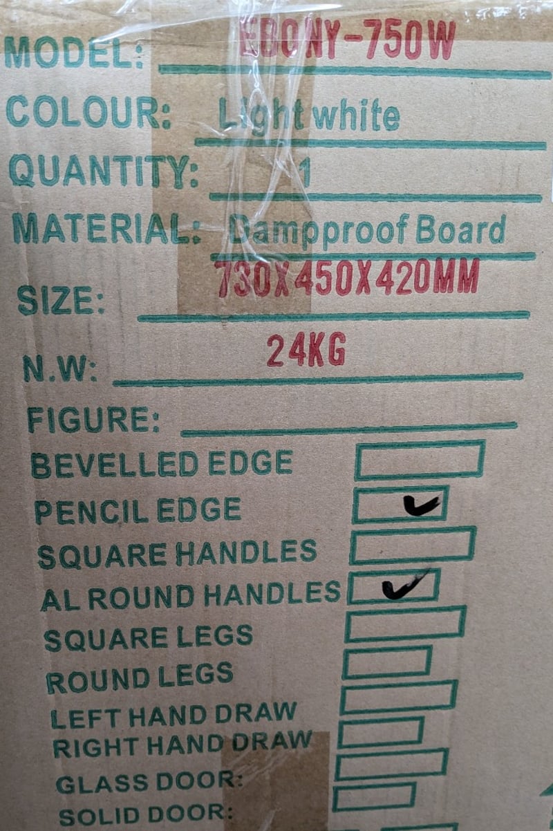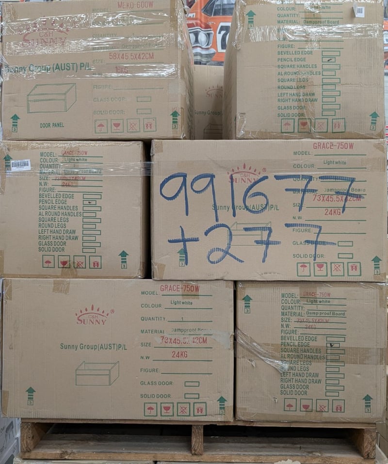 ASSORTED CABINETS. GRACE-750W QTY 6, MEKO-600W QTY 2, EBONY-750W QTY 3. 11 BOXES SOLD AS LOT.