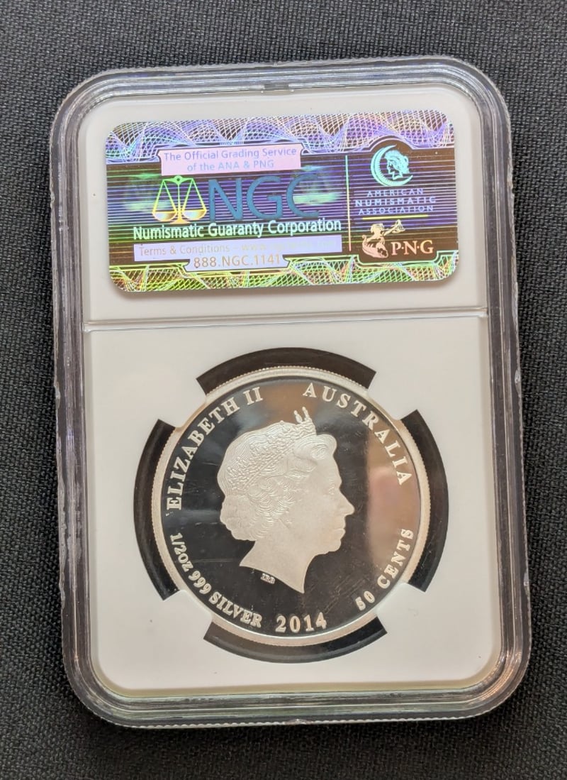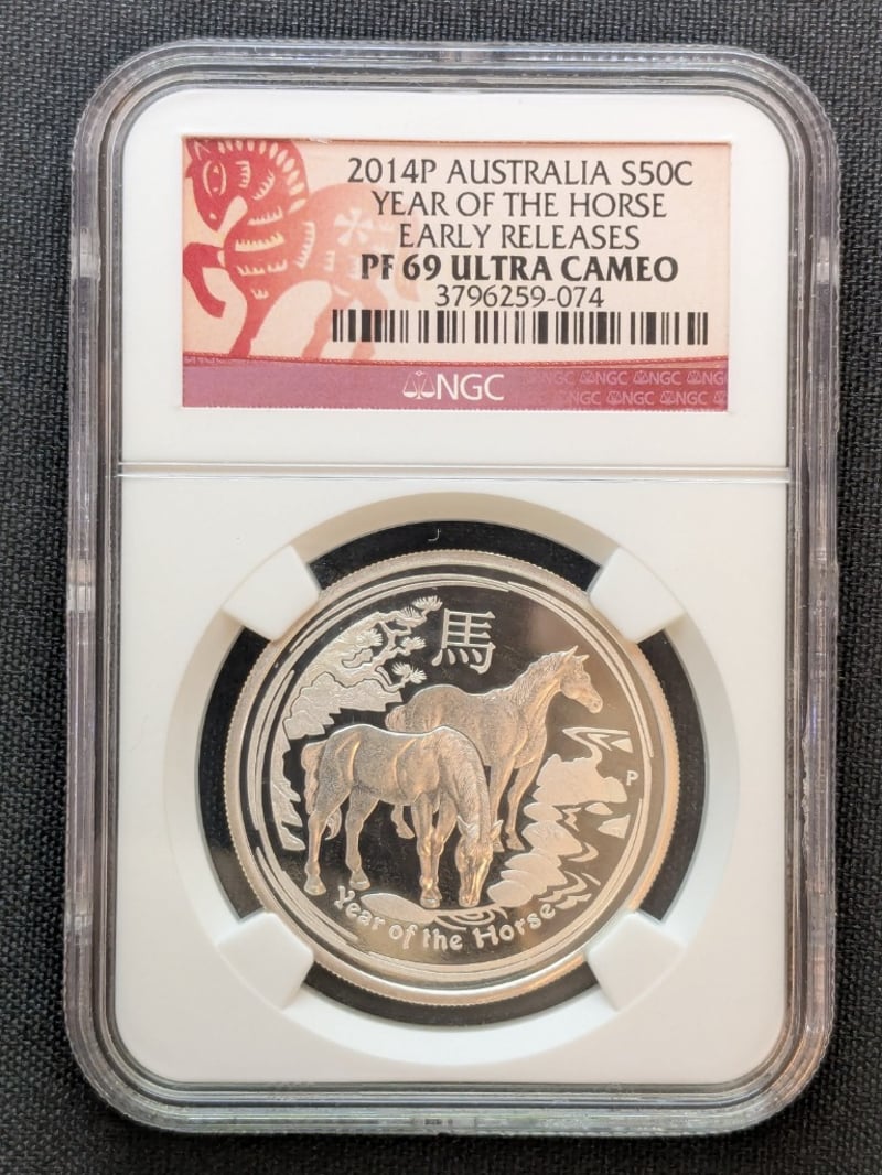 2014 YEAR OF THE HORSE AUSTRALIA FIFTY CENT COIN, PF 69 ULTRA CAMEO CONDITION1/2Oz Silver Coin584997+11