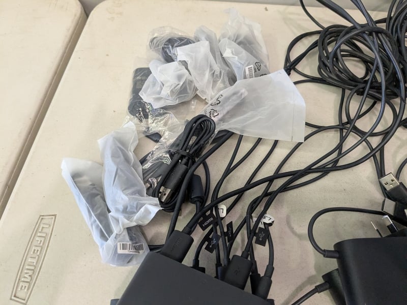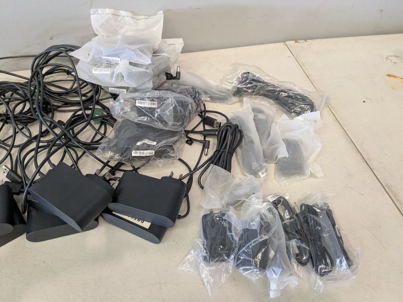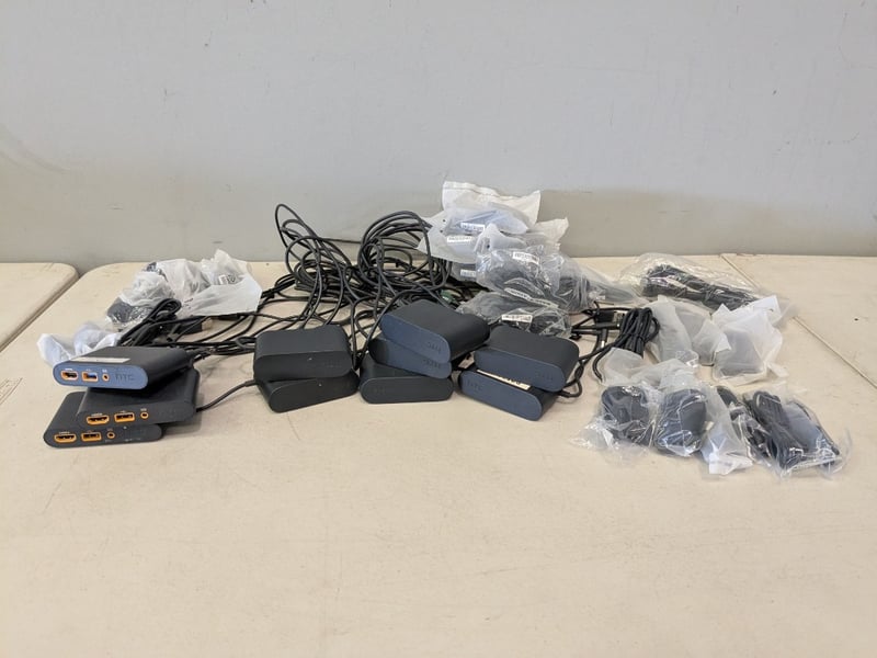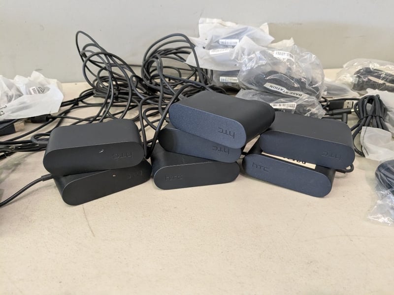 Assorted HTC Vive Link Boxes & Power Adapters including, Multiple HTC Vive Link Box interface units, Matching HTC power adapters, Assorted USB / HDMI / proprietary Vive cables.