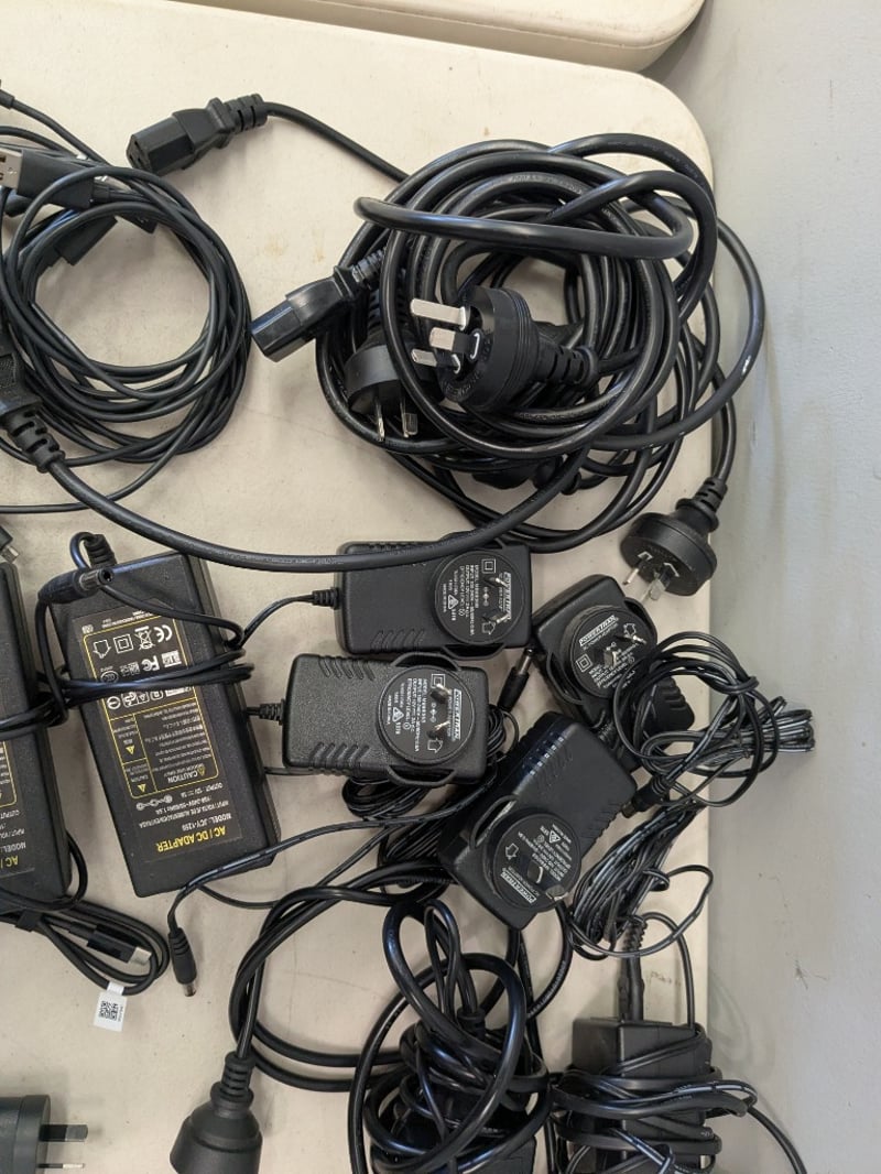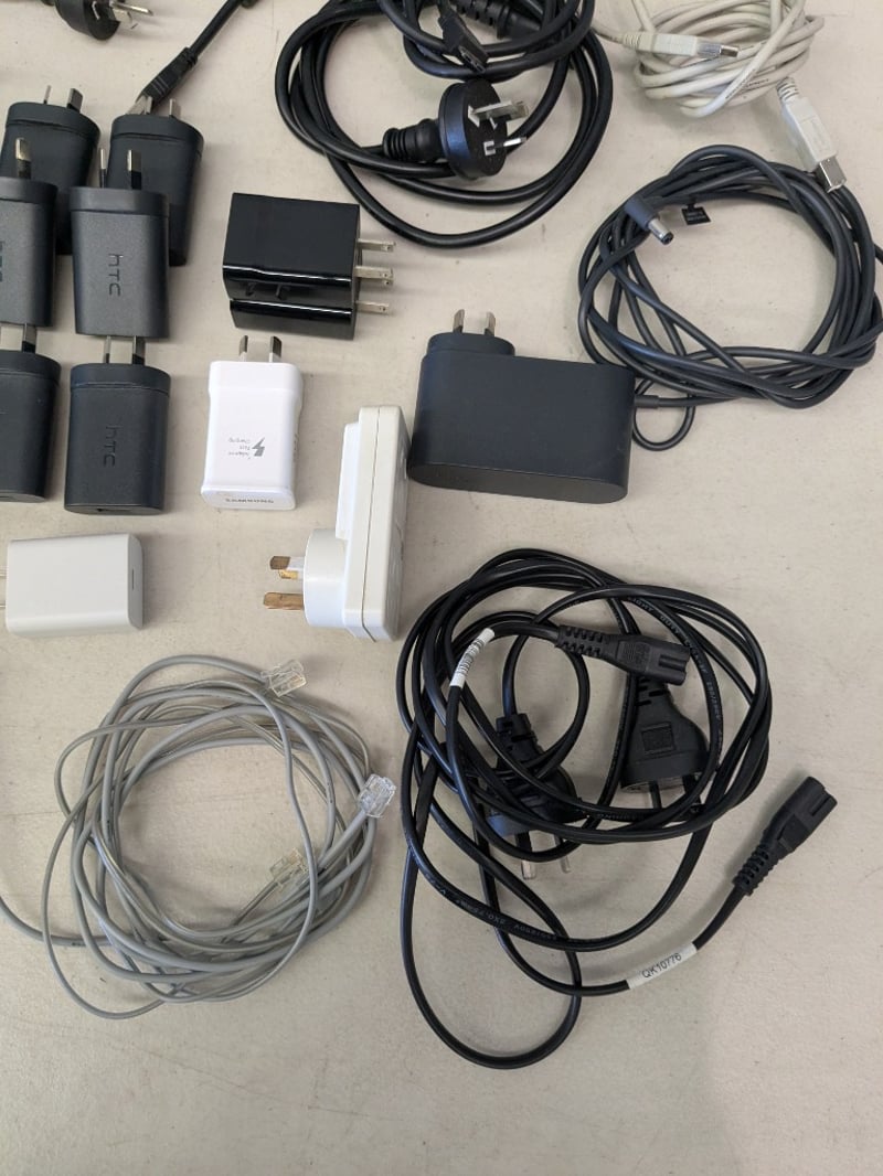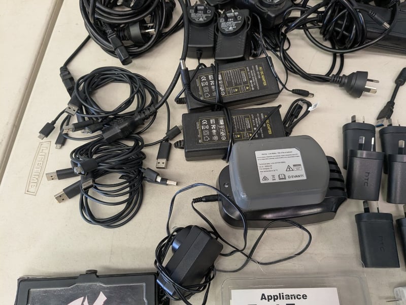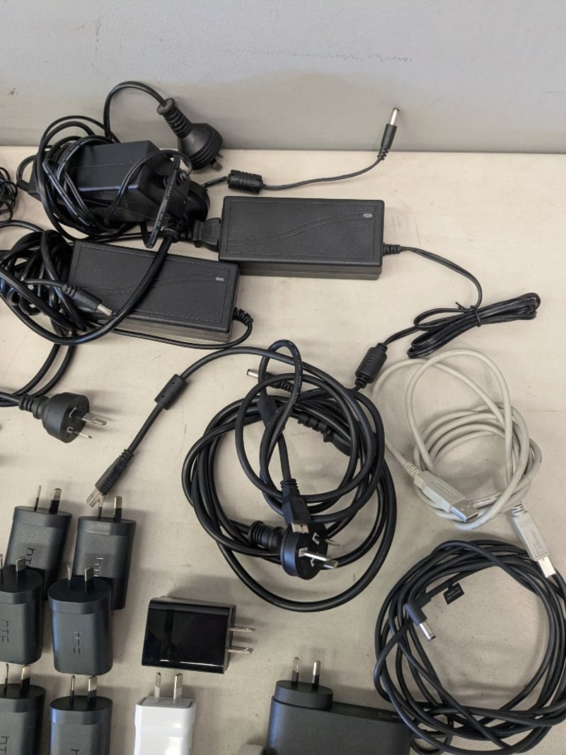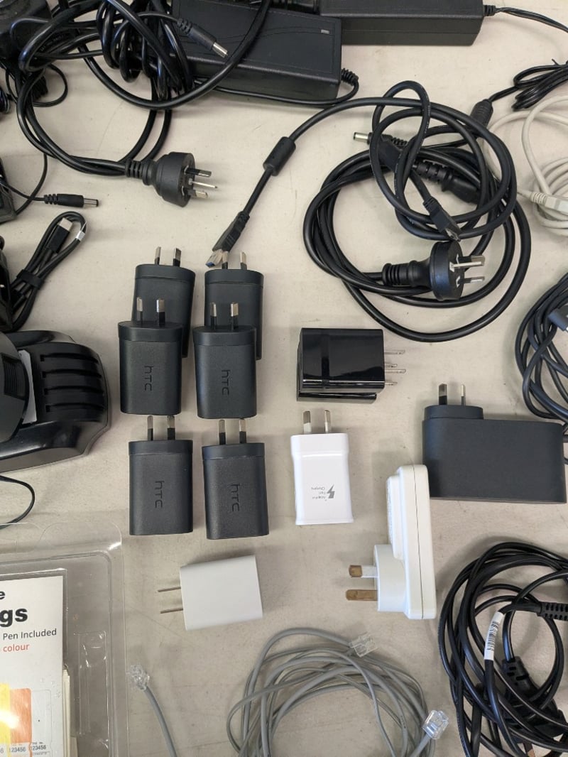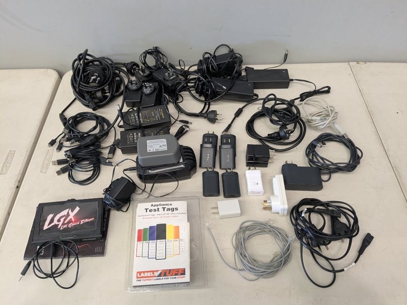 PARTS ONLY Assorted Electronics including, GX Live Gamer Extreme capture device with quick guide, Multiple power adapters / AC charger, Assorted USB, HDMI, Ethernet & audio cables, Wall plug chargers (various brands), Test & tag appliance labels, HTC Vive power bricks, and Miscellaneous adapters, connectors, and power splitters. Note: items are untested and sold as lot.