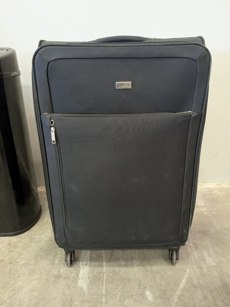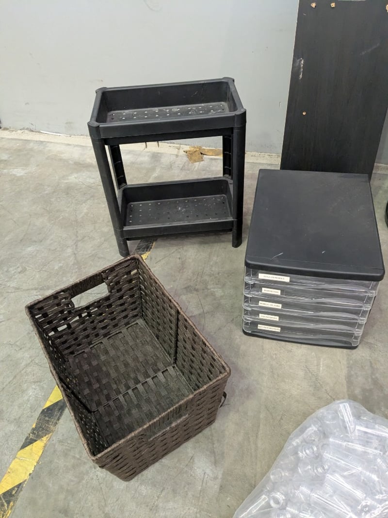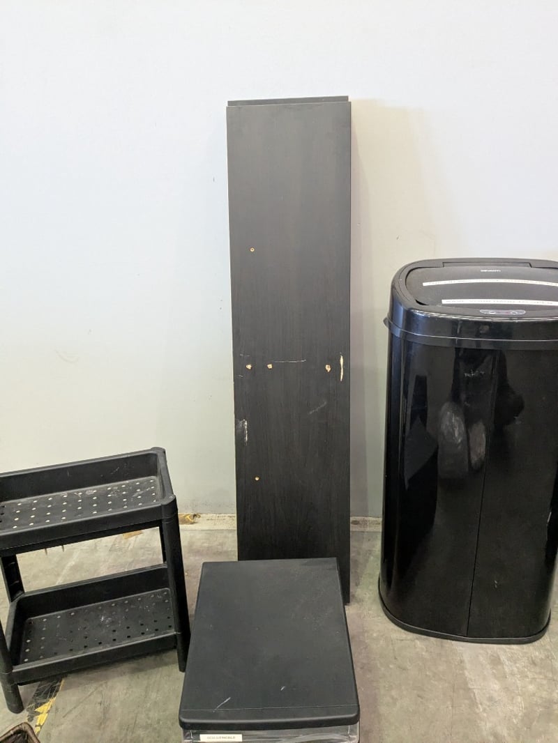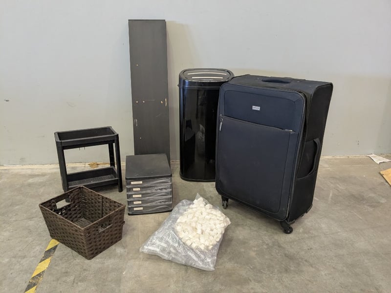 Assorted Miscellaneous Items including, a suitcase, an automatic bin,floating shelves, bulk amount of small bottles with lids and more.