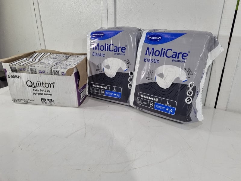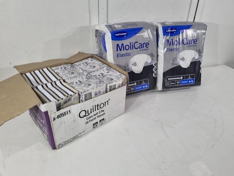 Molicare size L 115-145cm Incontinence pants 2x packs , 12x Packs Of Quilton 55 Tissues Sold As Lot