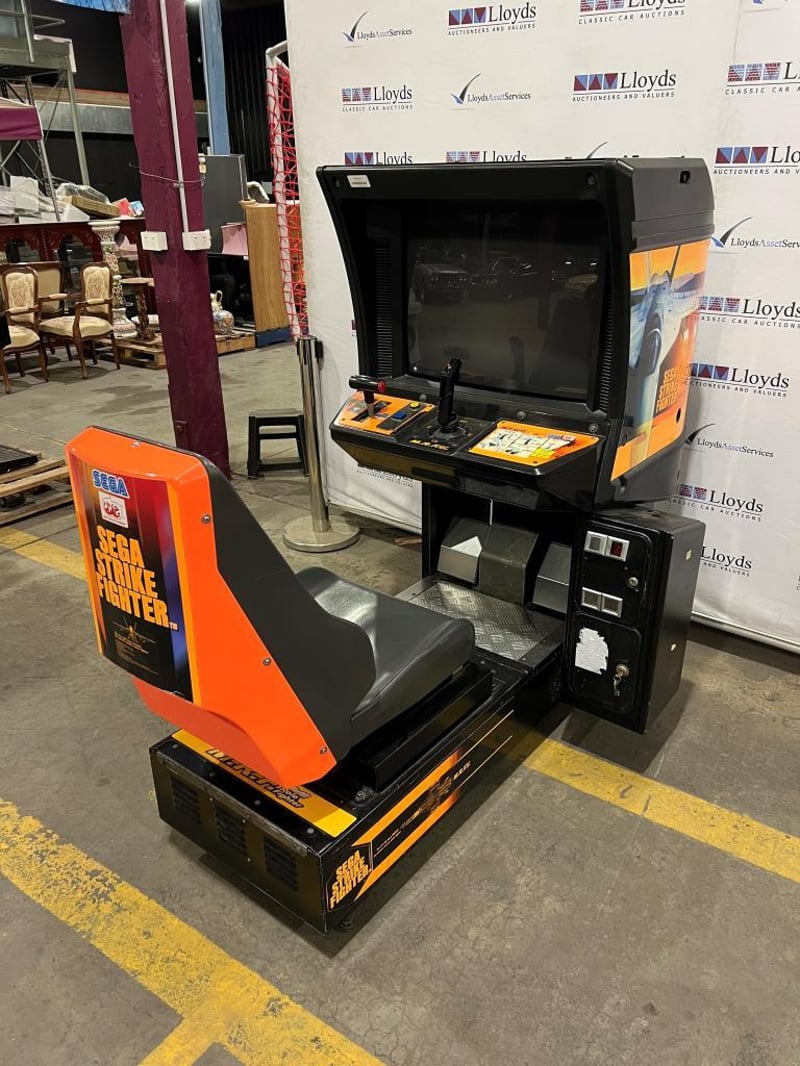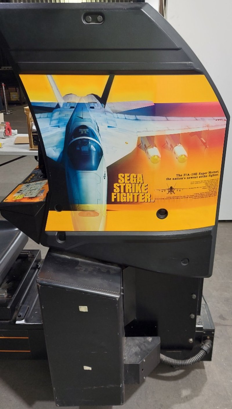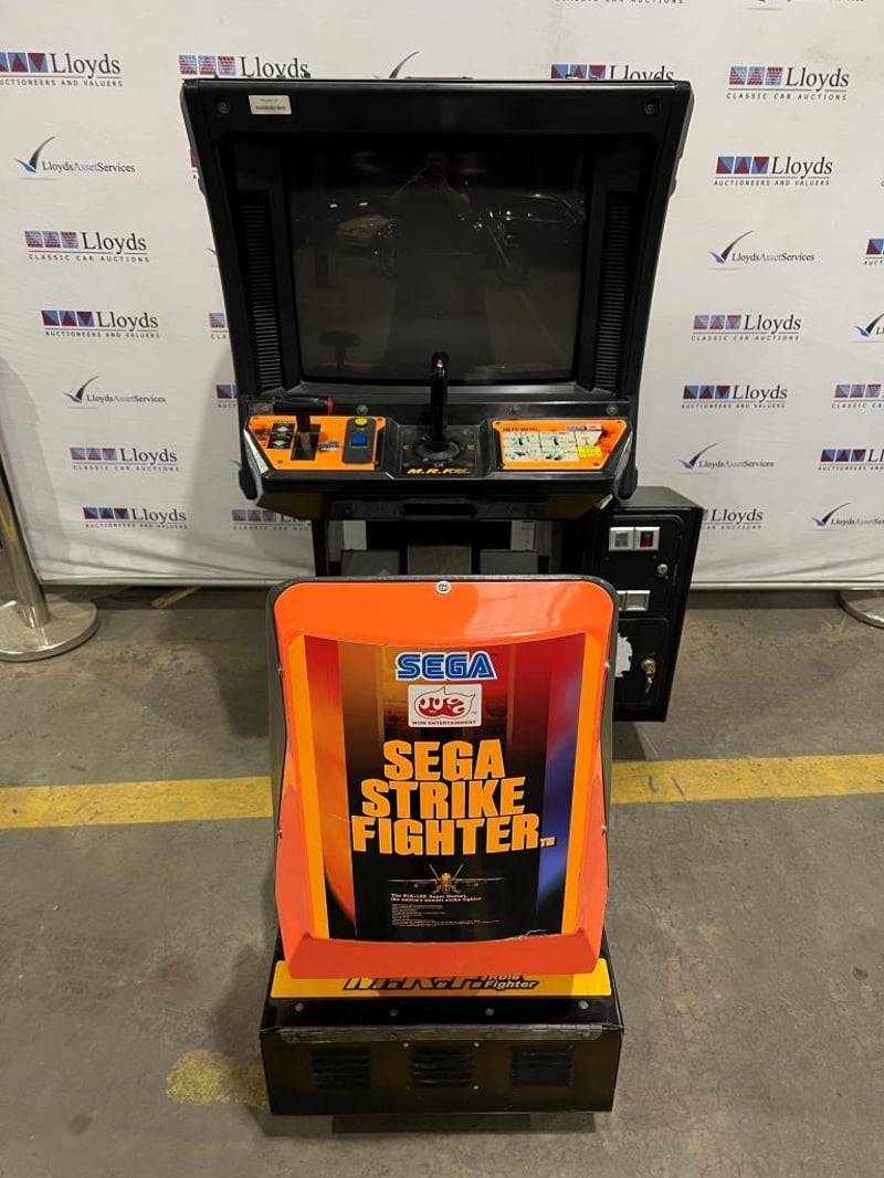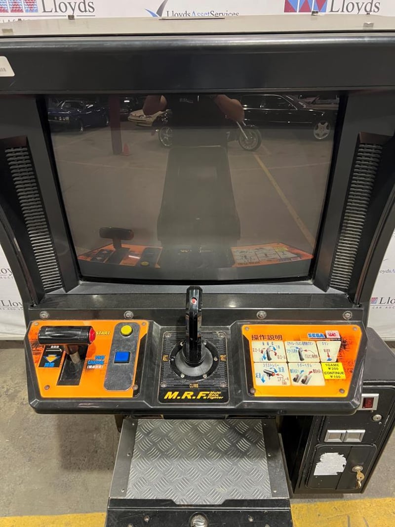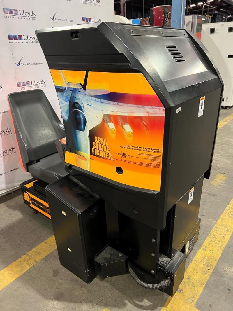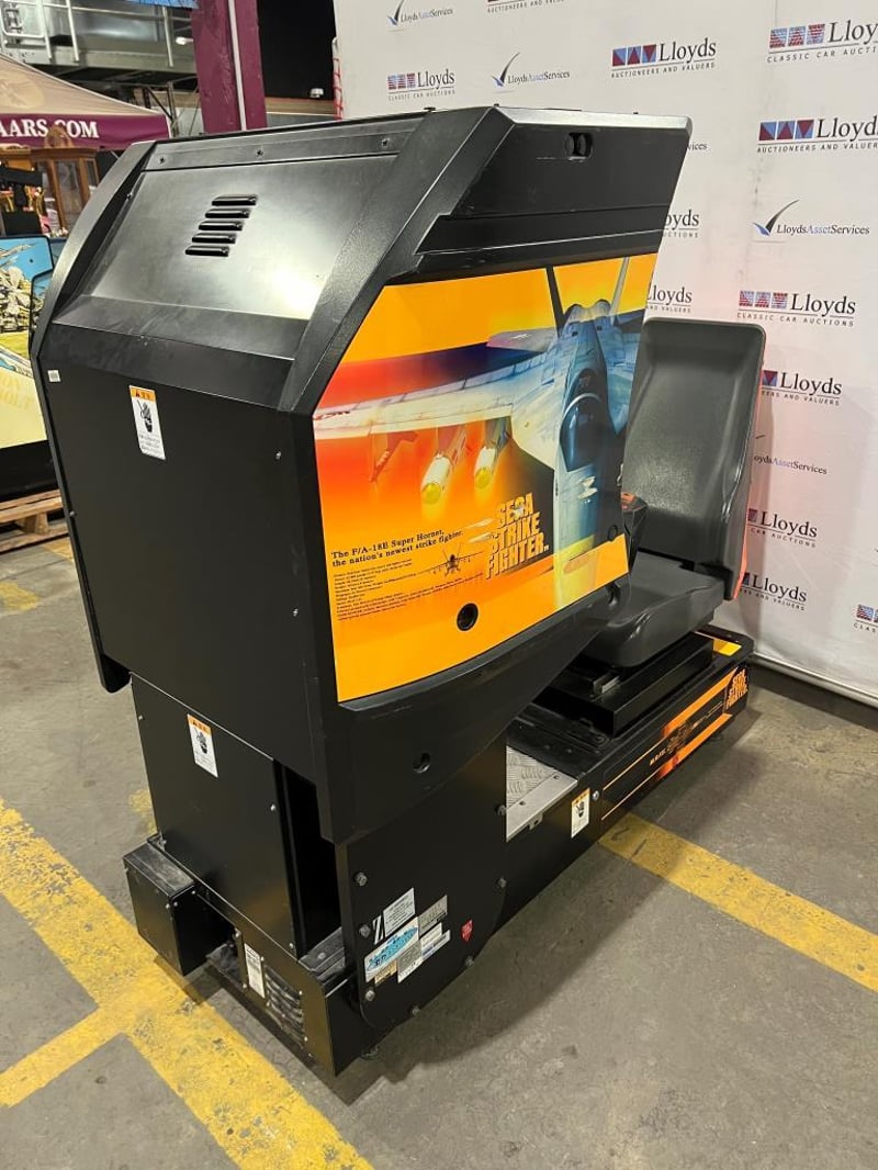 Sega strike fighter "Original Japanese machine, game is working and in English. Become the pilot of your own F/A-18 Hornet aircraft, battling your way through using guns and missiles whilst avoiding the enemies! Controls include rudder pedals, flight stick and thrust lever. A unique arcade game. Coin mechs removed, locks and keys supplied. Spare plastic main joystick lever supplied " Manufactured by Sega Enterprises Ltd, Serial number: 01028561 Dims: 152cm H, 190cm W, 105cm L Note: item is untested, signs of wear, inspection recommended.