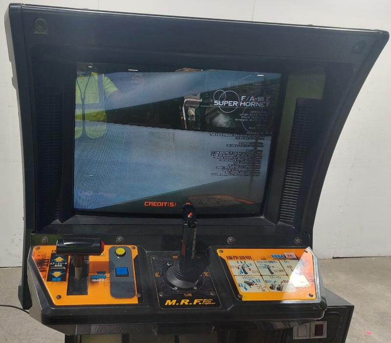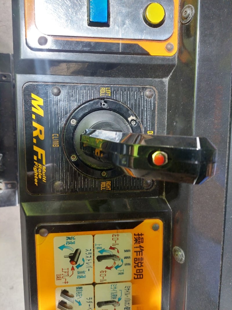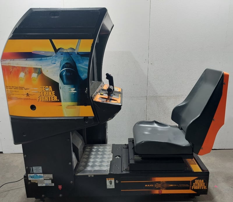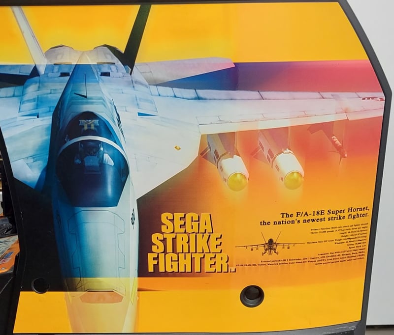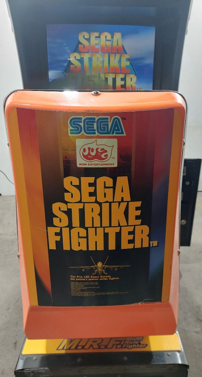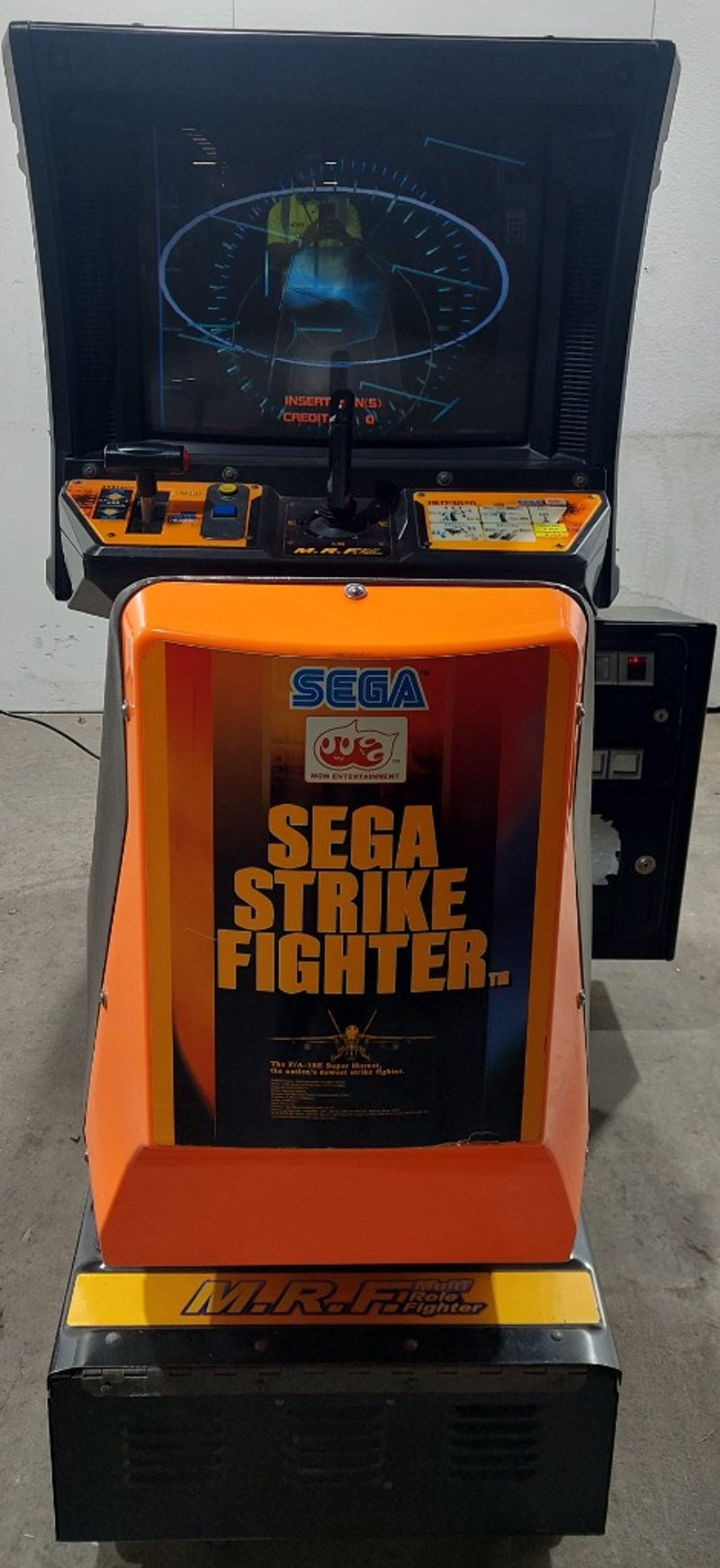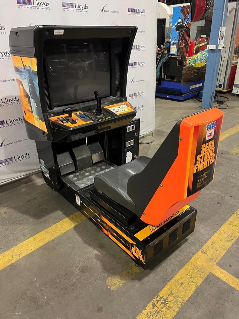 Sega strike fighter "Original Japanese machine, game is working and in English. Become the pilot of your own F/A-18 Hornet aircraft, battling your way through using guns and missiles whilst avoiding the enemies! Controls include rudder pedals, flight stick and thrust lever. A unique arcade game. Coin mechs removed, locks and keys supplied. Spare plastic main joystick lever supplied " Manufactured by Sega Enterprises Ltd, Serial number: 01028561 Dims: 152cm H, 190cm W, 105cm L Note: item is untested, signs of wear, inspection recommended.