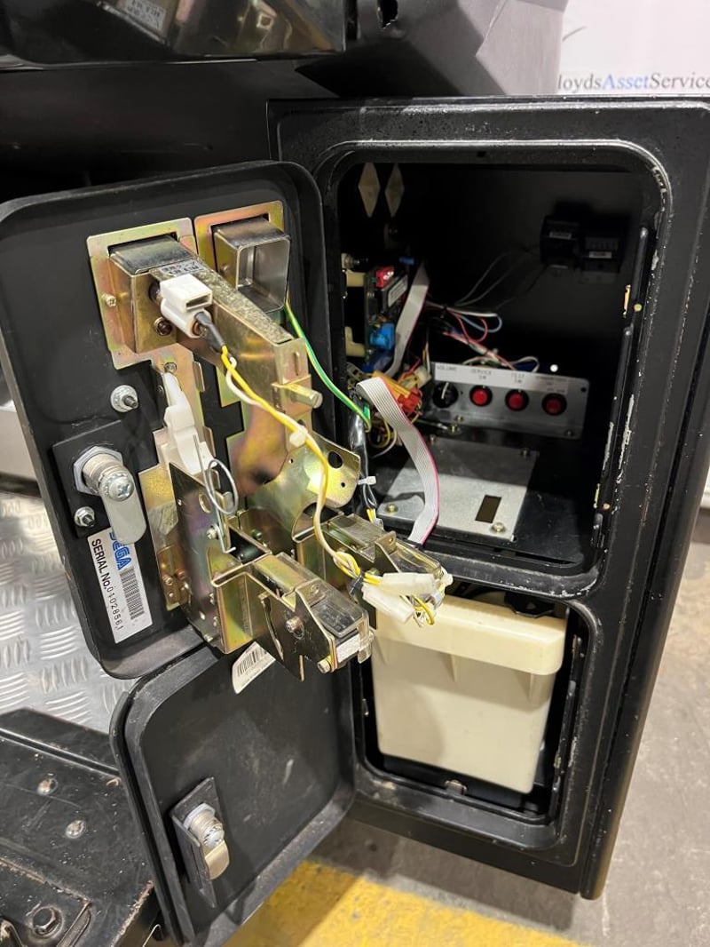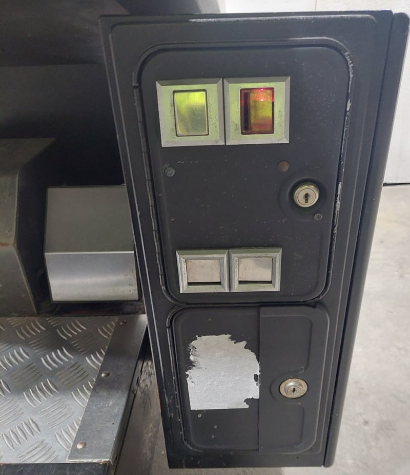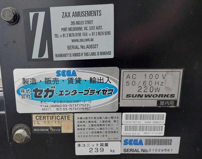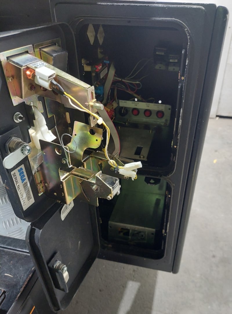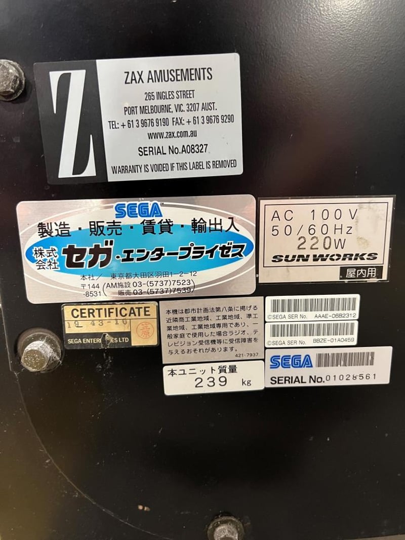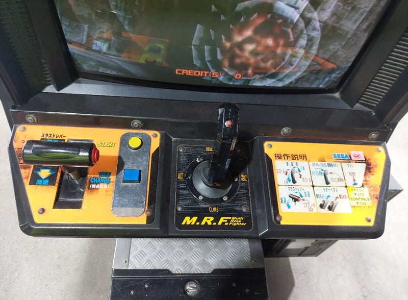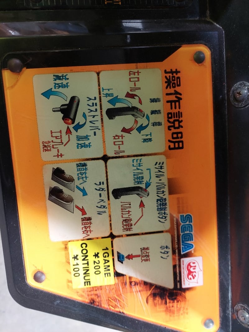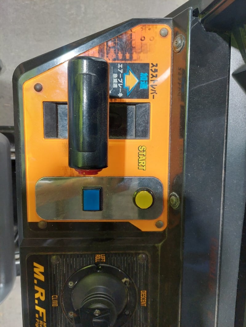 Sega strike fighter "Original Japanese machine, game is working and in English. Become the pilot of your own F/A-18 Hornet aircraft, battling your way through using guns and missiles whilst avoiding the enemies! Controls include rudder pedals, flight stick and thrust lever. A unique arcade game. Coin mechs removed, locks and keys supplied. Spare plastic main joystick lever supplied " Manufactured by Sega Enterprises Ltd, Serial number: 01028561 Dims: 152cm H, 190cm W, 105cm L Note: item is untested, signs of wear, inspection recommended.