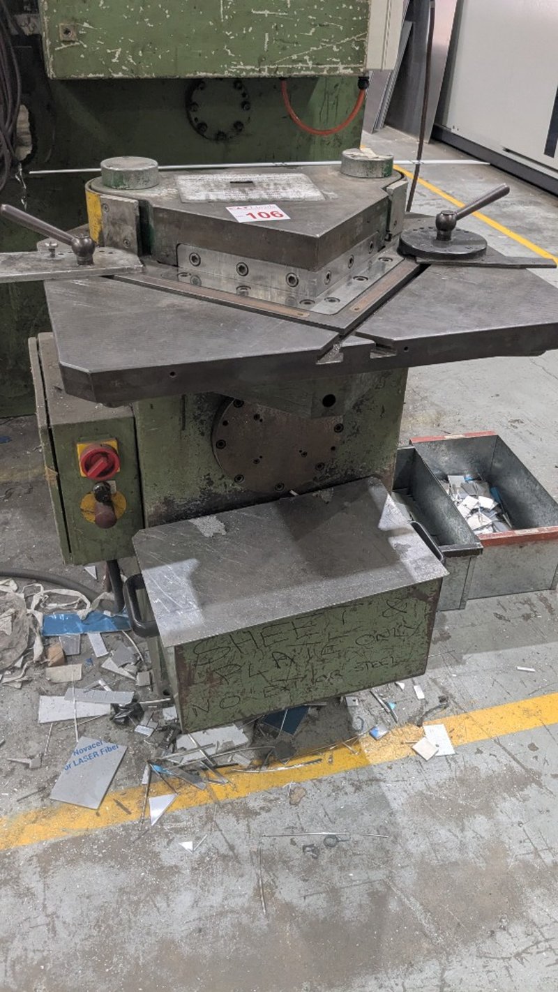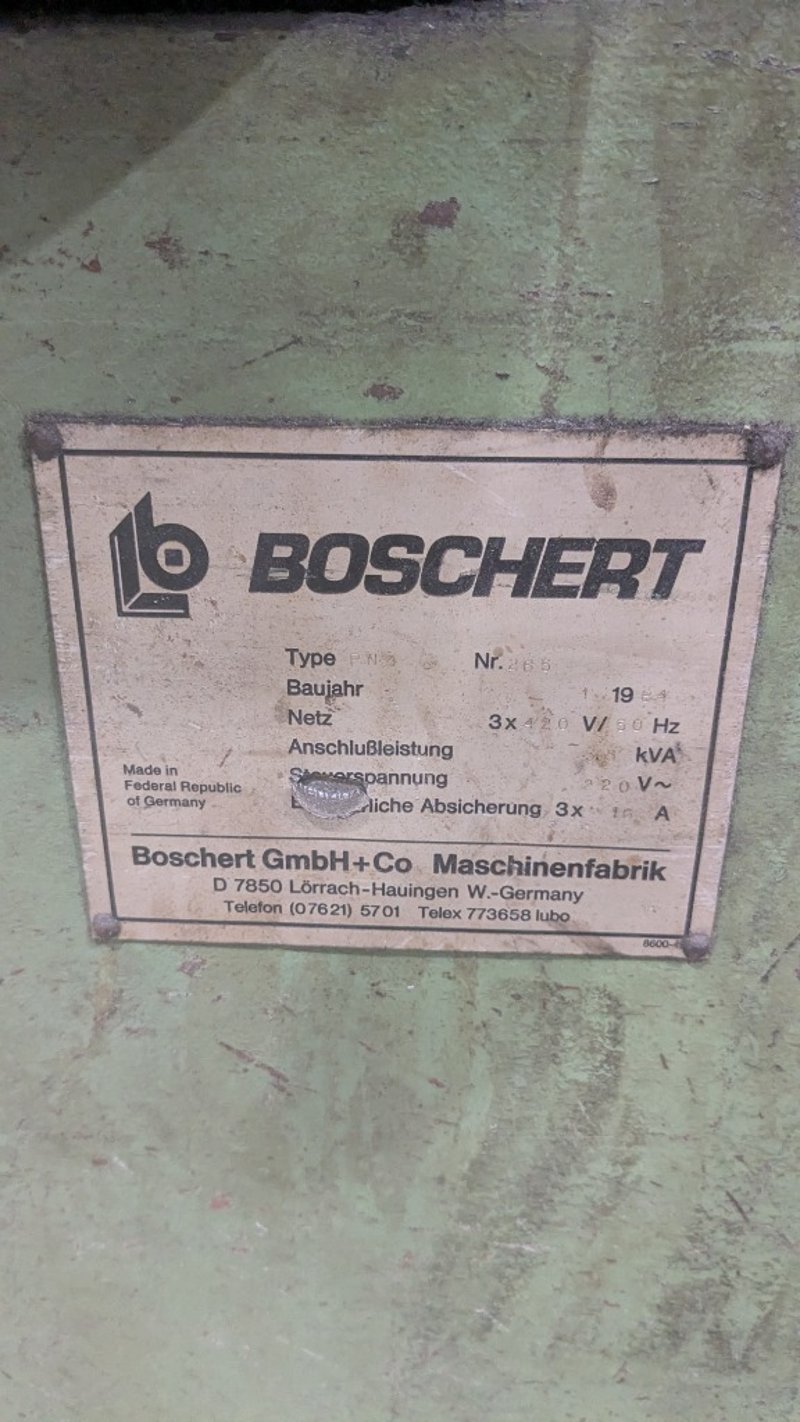 Boschert LB 12 K4 notching machineBrand: BoschertModel: LB 12 K4Description/Extras: 3 Phase, Catcher Box Dimensions: 710mm(W) x 1000mm(D) x 950mm(H)NOTE: INSPECTIONS HIGHLY RECOMMENDED, BUYER TO PROVIDE OWN LABOUR AND TOOLS FOR SAFE REMOVAL OF ASSET