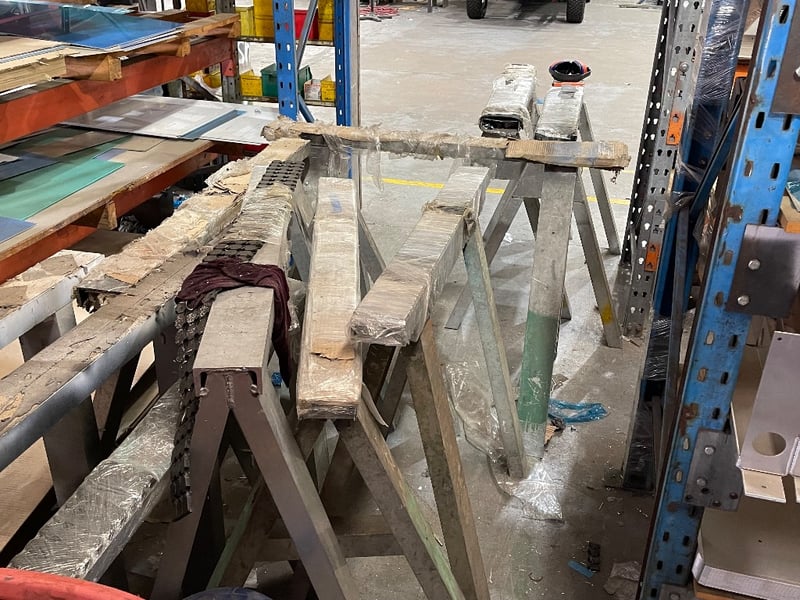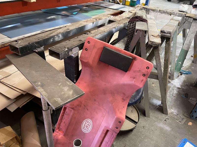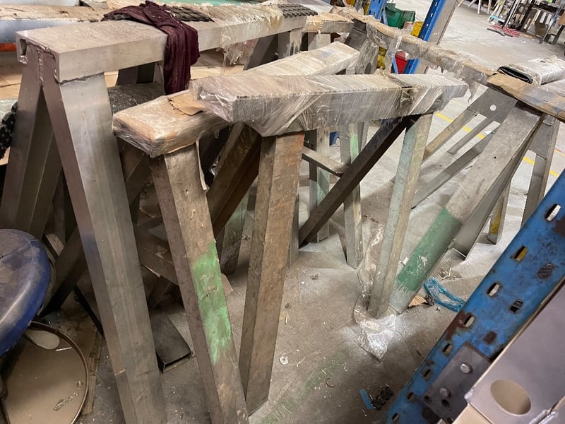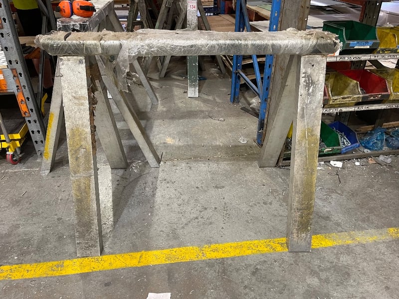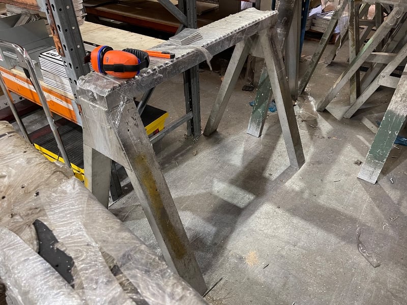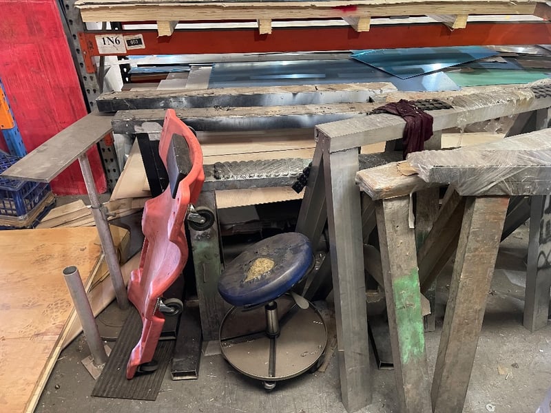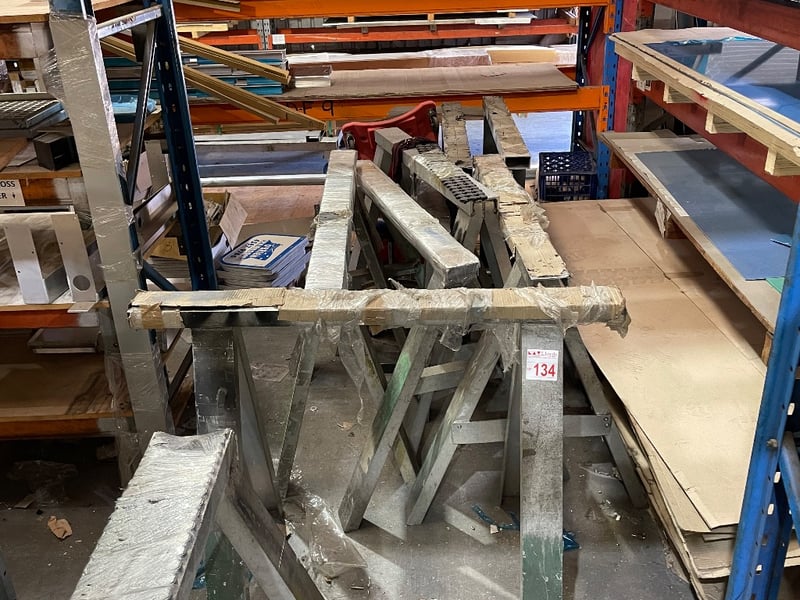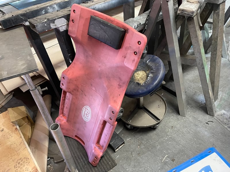 - 10x steel saw horses - blue workshop chair & red mechanic car dollySold as lot, must take all