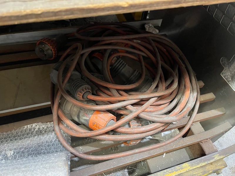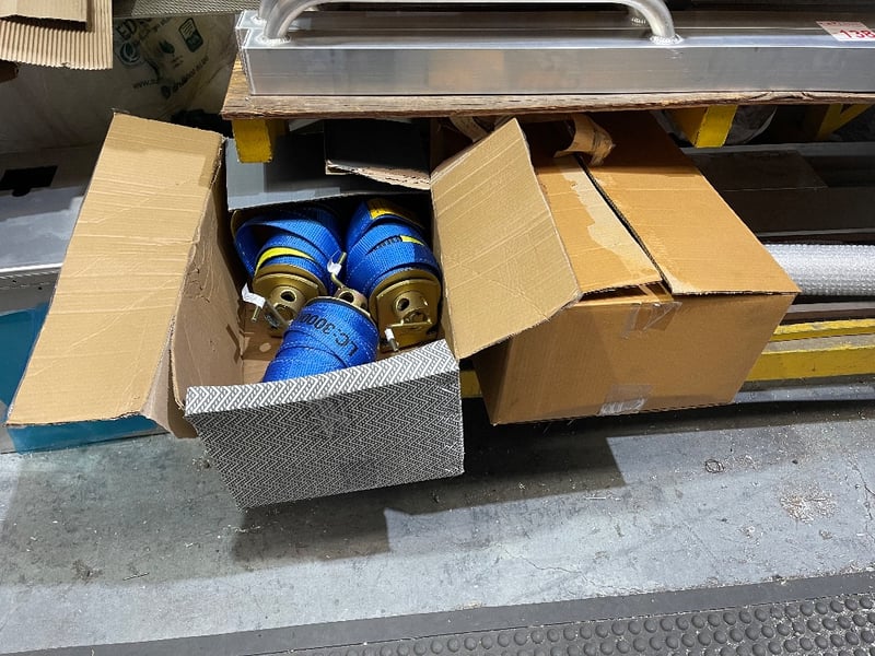 Assortment of vehicle / trailer equipments(Shelving not included) Items include austlift ratchet tie down, metal side bar handles , power cables & many more…Note: must take all