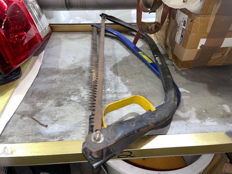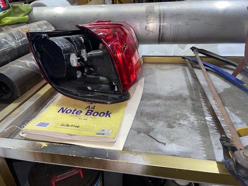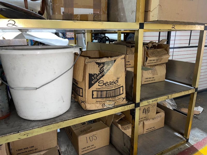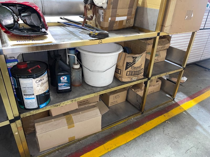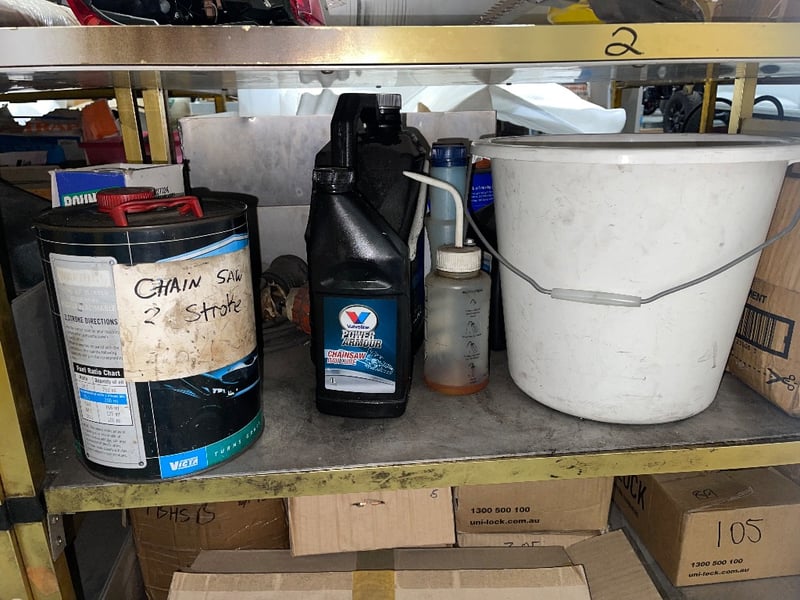 Assortment of tools / liquids Items include chain saw 2 stroke oil, chain saw bar lube, trailer brake lights & more… (shelf/table included)REFER TO PHOTOS note: Sold as lot must take all