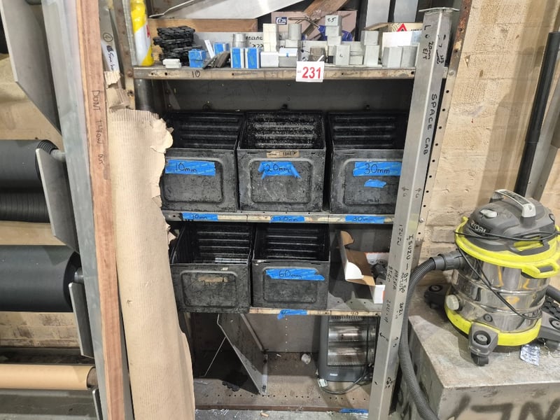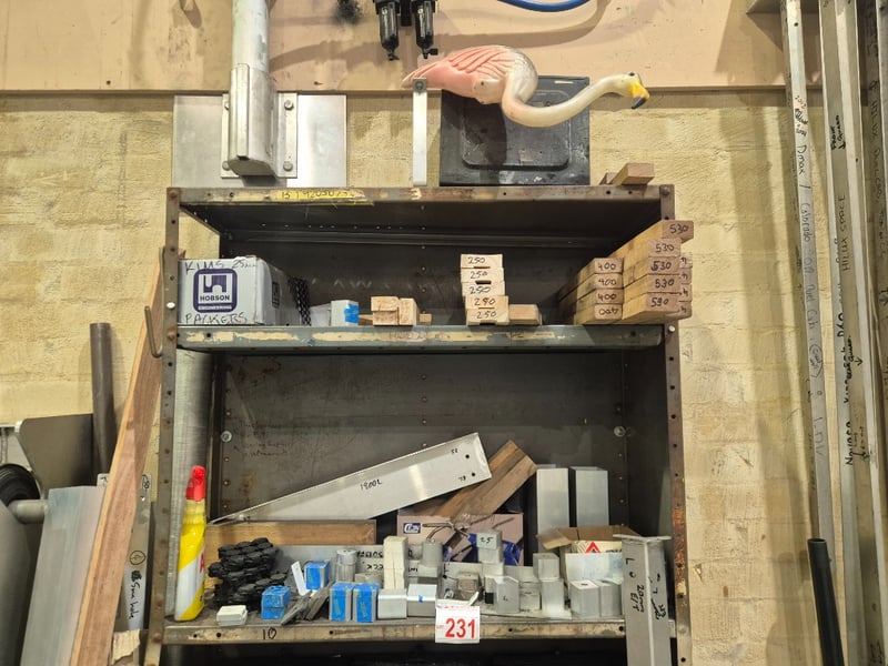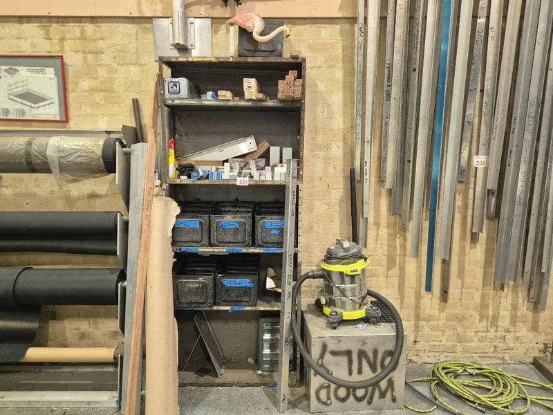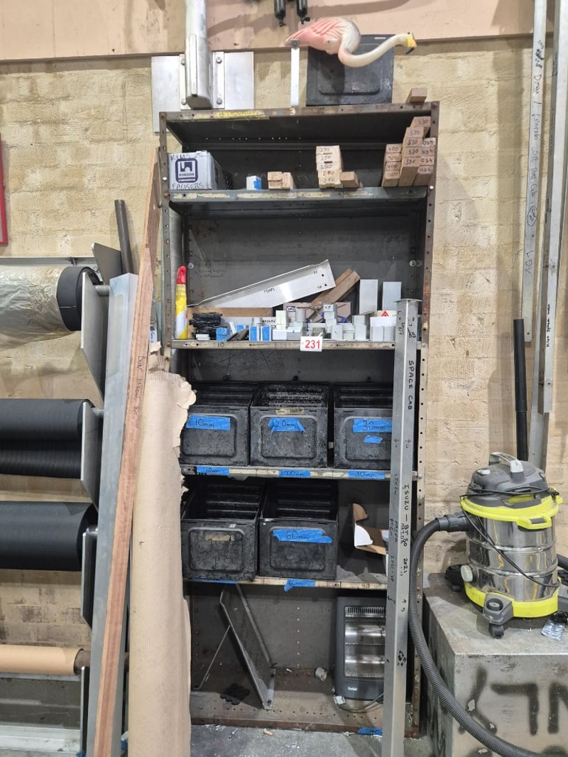 Metal Shelving w/ Assorted cuts of Aluminium, Aluminium BoxRyobi Vaccum CleanerMetal Pipe & BeamsSold as Lot MUST TAKE ALL