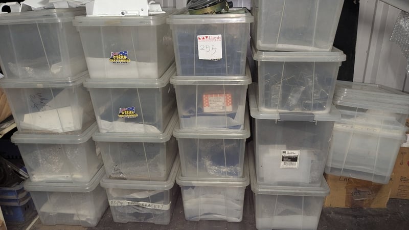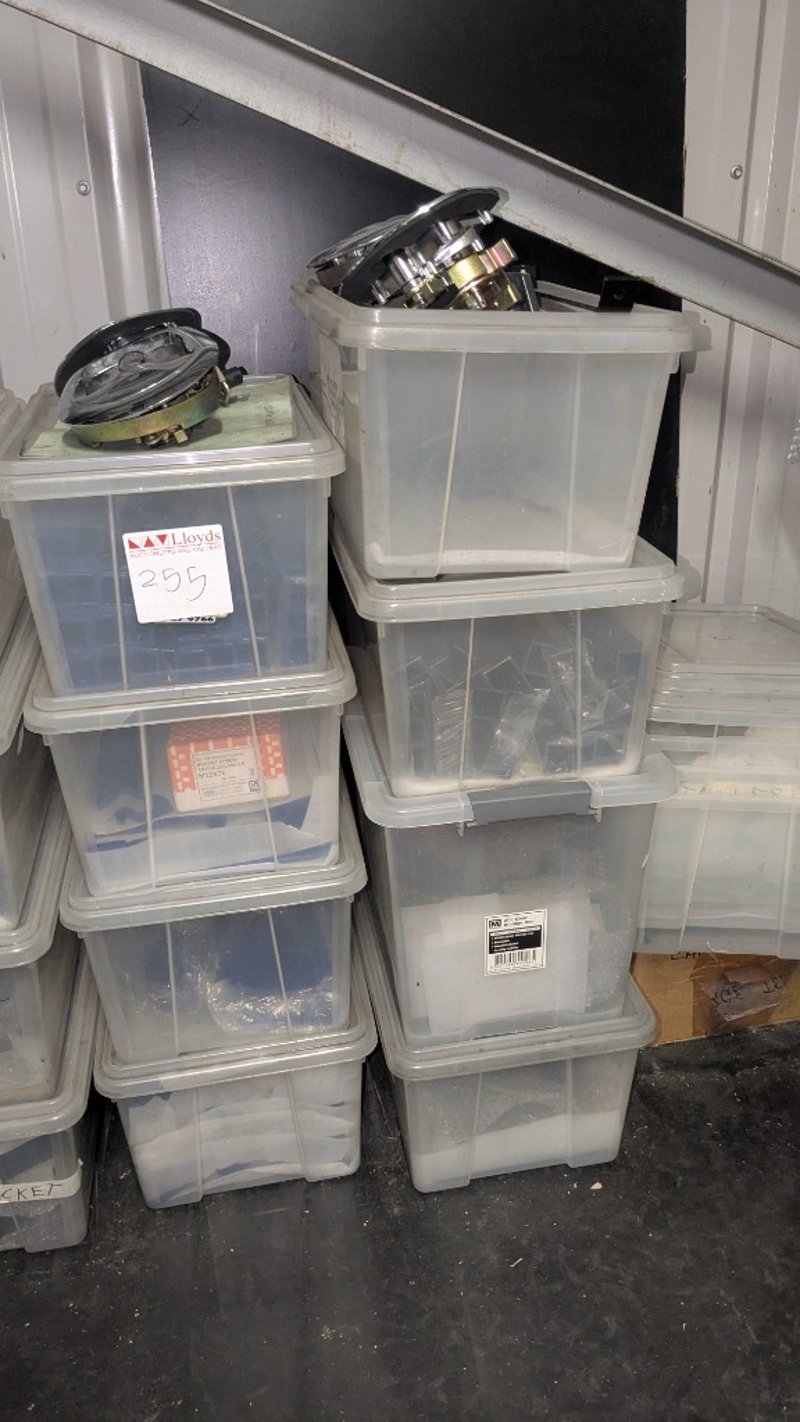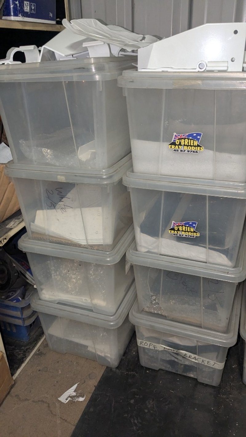Plastic Storage Boxes, 20L Capacity, Includes Assorted Hardware ItemsSOLD AS LOT NOTE: UP ON MEZZANINE, INSPECTIONS HIGHLY RECOMMENDED, BUYER TO PROVIDE OWN LABOUR AND TOOLS FOR SAFE REMOVAL OF ASSET