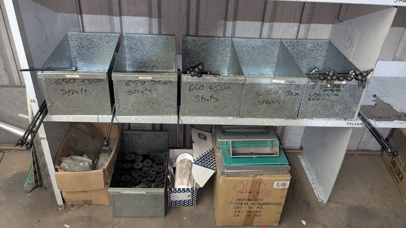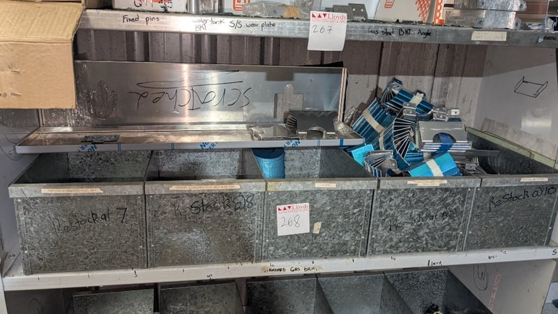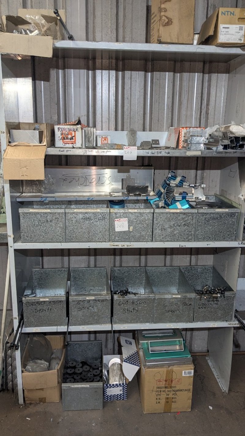 Assorted Metal Fabrication Components, Includes Hinges, Gas Struts and more SOLD AS LOTNOTE: UP ON MEZZANINE, INSPECTIONS HIGHLY RECOMMENDED, BUYER TO PROVIDE OWN LABOUR AND TOOLS FOR SAFE REMOVAL OF ASSET