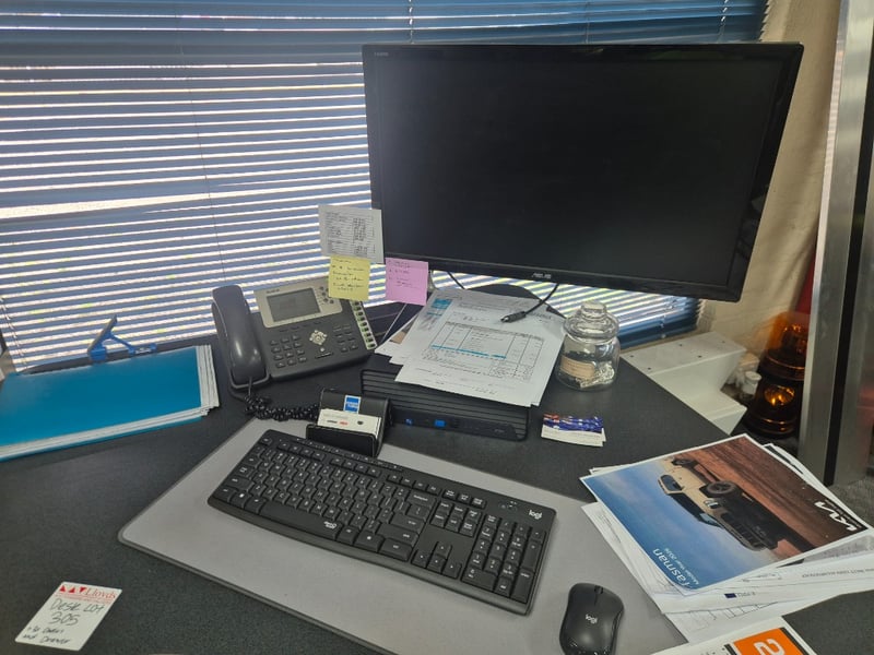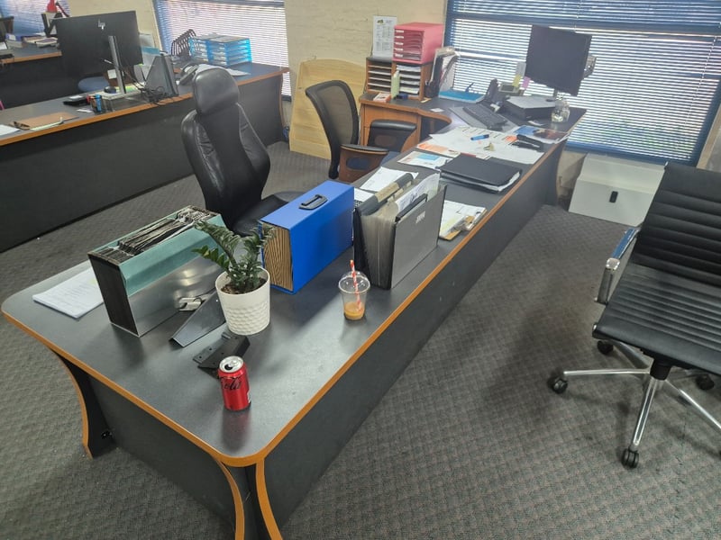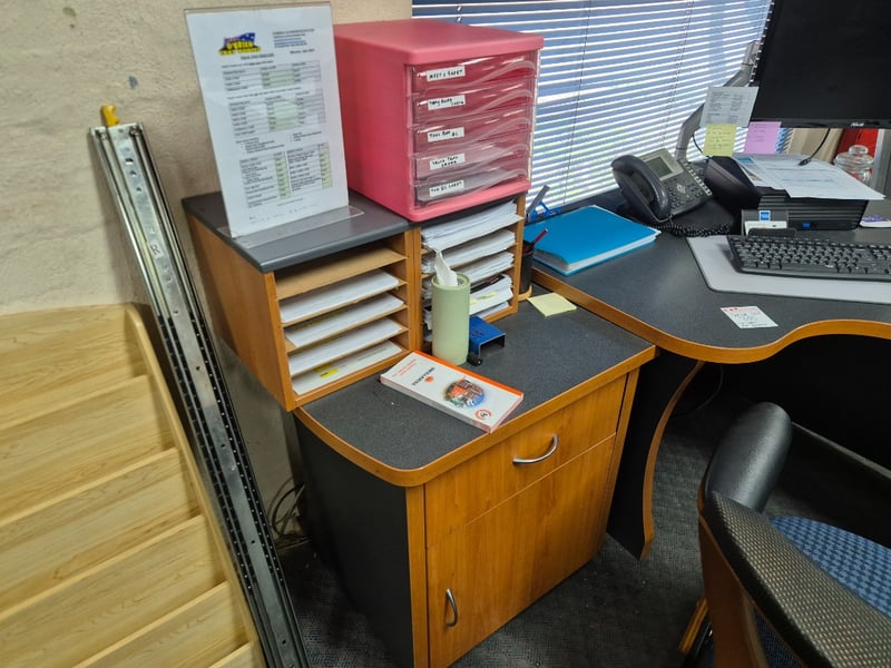 Desk LotLarge Desk2x ChairsI5 HP Pro Desk Desktop, Monitor, Keyboard & MouseSide Drawer 2 DrawerAssorted Stationary & MoreSodl as Lot MUST TAKE All