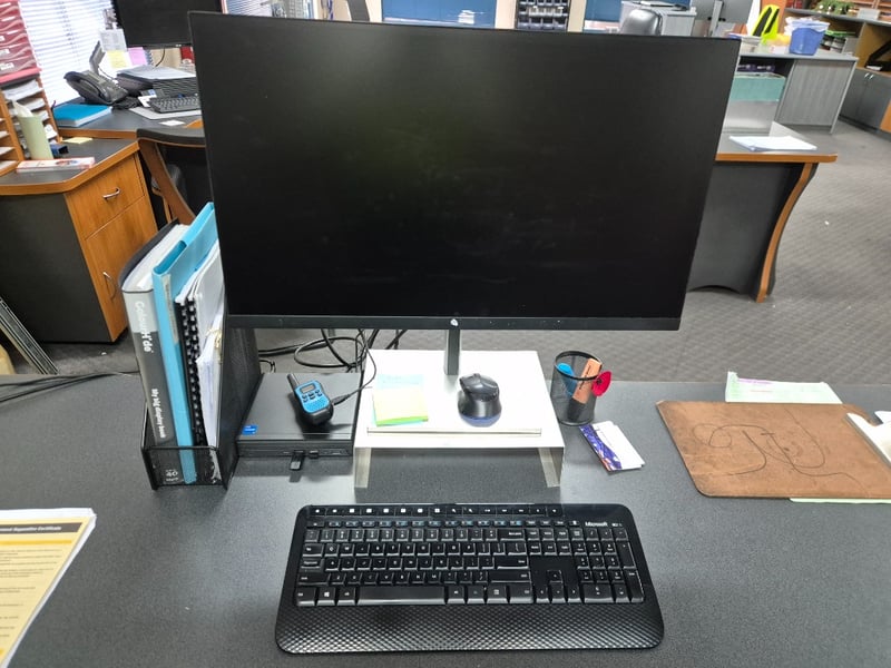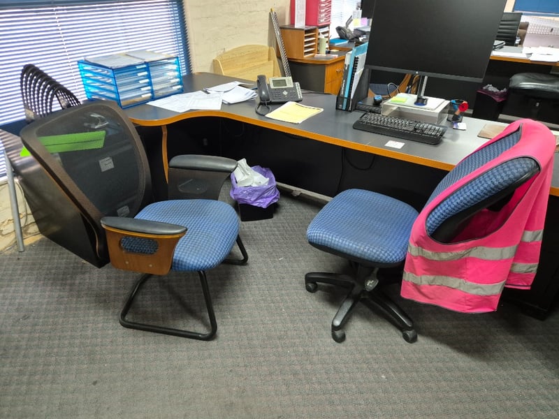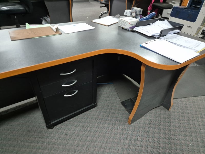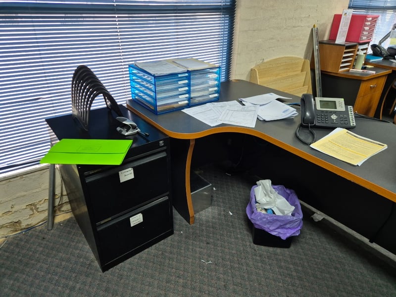 Desk LotLarge Desk2x ChairsI5 HP Pro Mini Nuc Desk Desktop, Monitor, Keyboard & Mouse2x Side Drawer/ Filing CabinetAssorted Stationary & MoreSodl as Lot MUST TAKE All